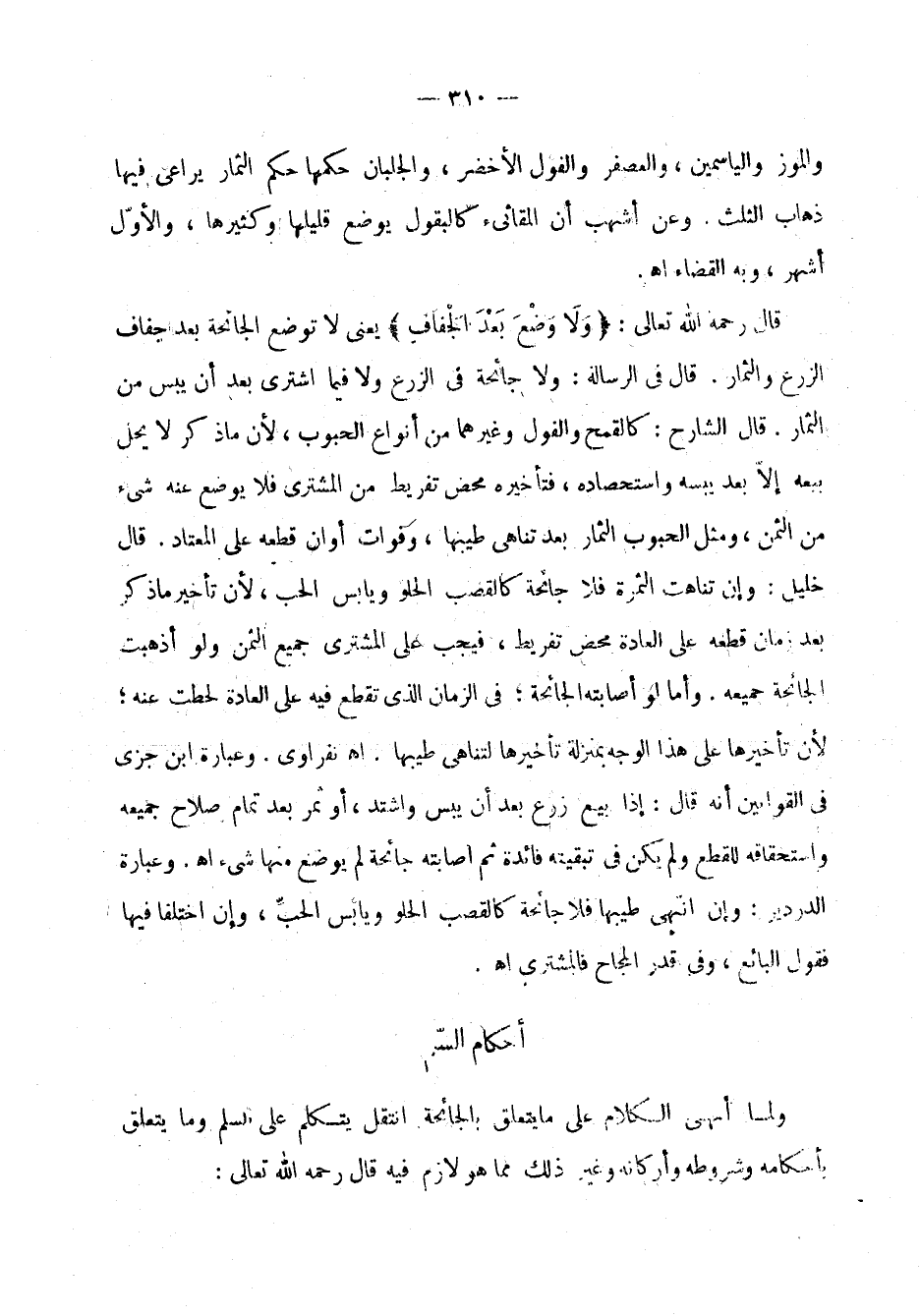 ولما أنهى الكلام على ما يتعلق بالجائحة انتقل يتكلم على السَّلَم وما يتعلق بأحكامه وشروطه وأركانه وغير ذلك مما هو لازم فيه. قال رحمه الله تعالى: