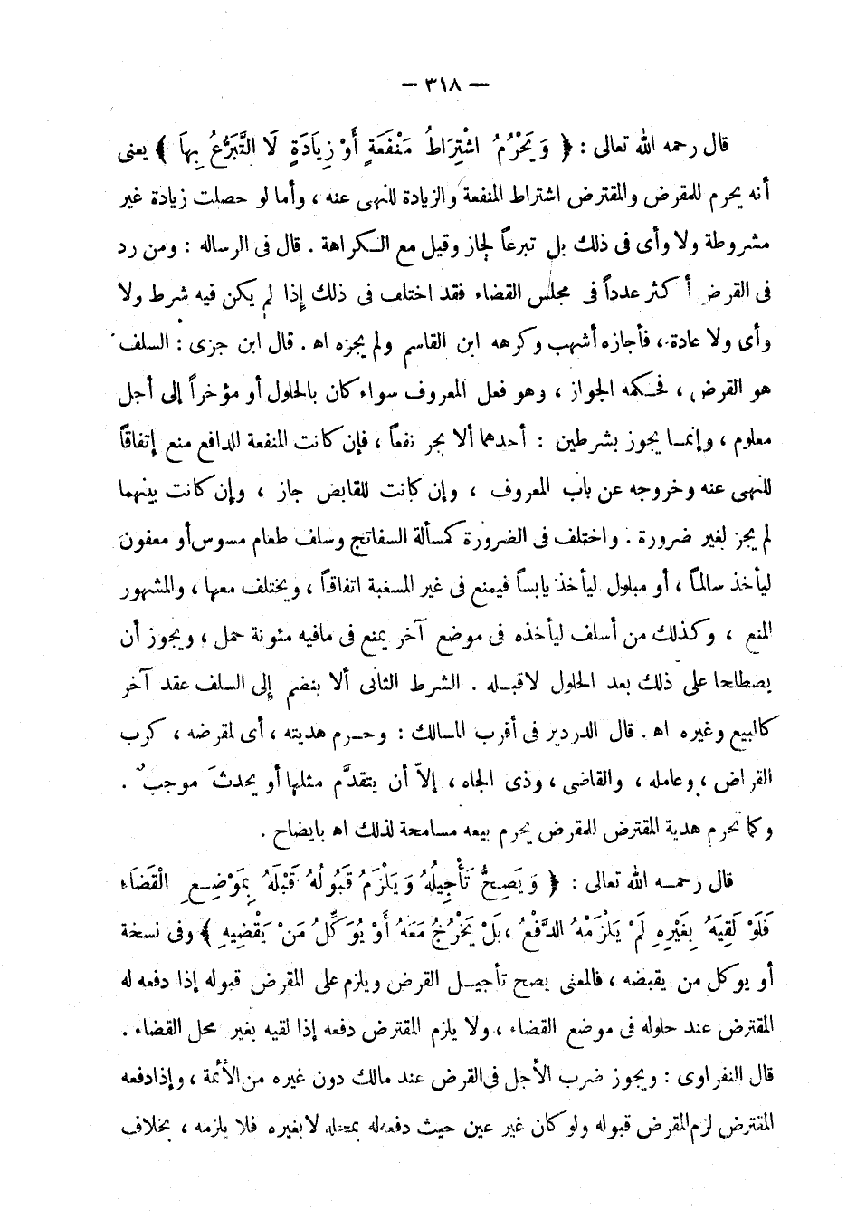 قال رحمه الله تعالى: " ويحرم اشتراط منفعة أو زيادة لا التبرع بها " يعني أنه يحرم للمقرض والمقترض اشتراط المنفعة والزيادة للنهي عنه، وأما لو حصلت زيادة غير مشروطة ولا وأي في ذلك بل تبرعاً لجاز وقيل مع الكراهة. قال في الرسالة: ومن رد في القرض أكثر عدداً في مجلس القضاء فقد اختلف في ذلك إذا لم يكن فيه شرط ولا وأي ولا عادة، فأجازه أشهب وكرهه ابن القاسم ولم يجزه اهـ. قال ابن جزي: السلف هو القرض، فحكمه الجواز، وهو فعل المعروف سواء كان بالحلول أو مؤخراً إلى أجل معلوم، وإنما يجوز بشرطين: أحدهما ألا يجر نفعاً، فإن كانت المنفعة للدافع منع اتفاقاً للنهي عنه وخروجه عن باب المعروف، وإن كانت للقابض جاز، وإن كانت بينهما لم يجز لغير ضرورة. واختلف في الضرورة كمسألة السفاتج وسلف طعام مسوس أو معفون ليأخذ