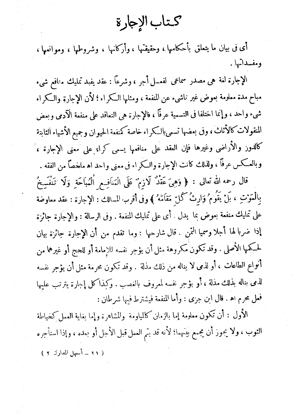 قال رحمه الله تعالى: " وهي عقد لازم على المنافع المباحة ولا تنفسخ بالموت، بل يقوم وارث كلٍّ مقامَه " وفي أقرب المسالك: الإجارة: عقد معاوضة على تمليك منفعة بعوض بما يدل أي على تمليك المنفعة. وفي الرسالة: والإجارة جائزة إذا ضربا لها أجلاً وسميا الثمن. قال شارحها: وما تقدم من أن الإجارة جائزة بيان لحكمها الأصلي. وقد تكون مكروهة مثل أن يؤجر نفسه للإمامة أو للحج أو غيرهما من أنواع الطاعات، أو لذمي لا يناله من ذلك مذلة. وقد تكون محرمة مثل أن يؤجر نفسه لذمي يناله بذلك مذلة أو يؤجر نفسه لمعروف بالغصب. وكذا كل إجارة يترتب عليها فعل محرم اهـ. قال ابن جزي: وأما المنفعة فيشترط فيها شرطان: