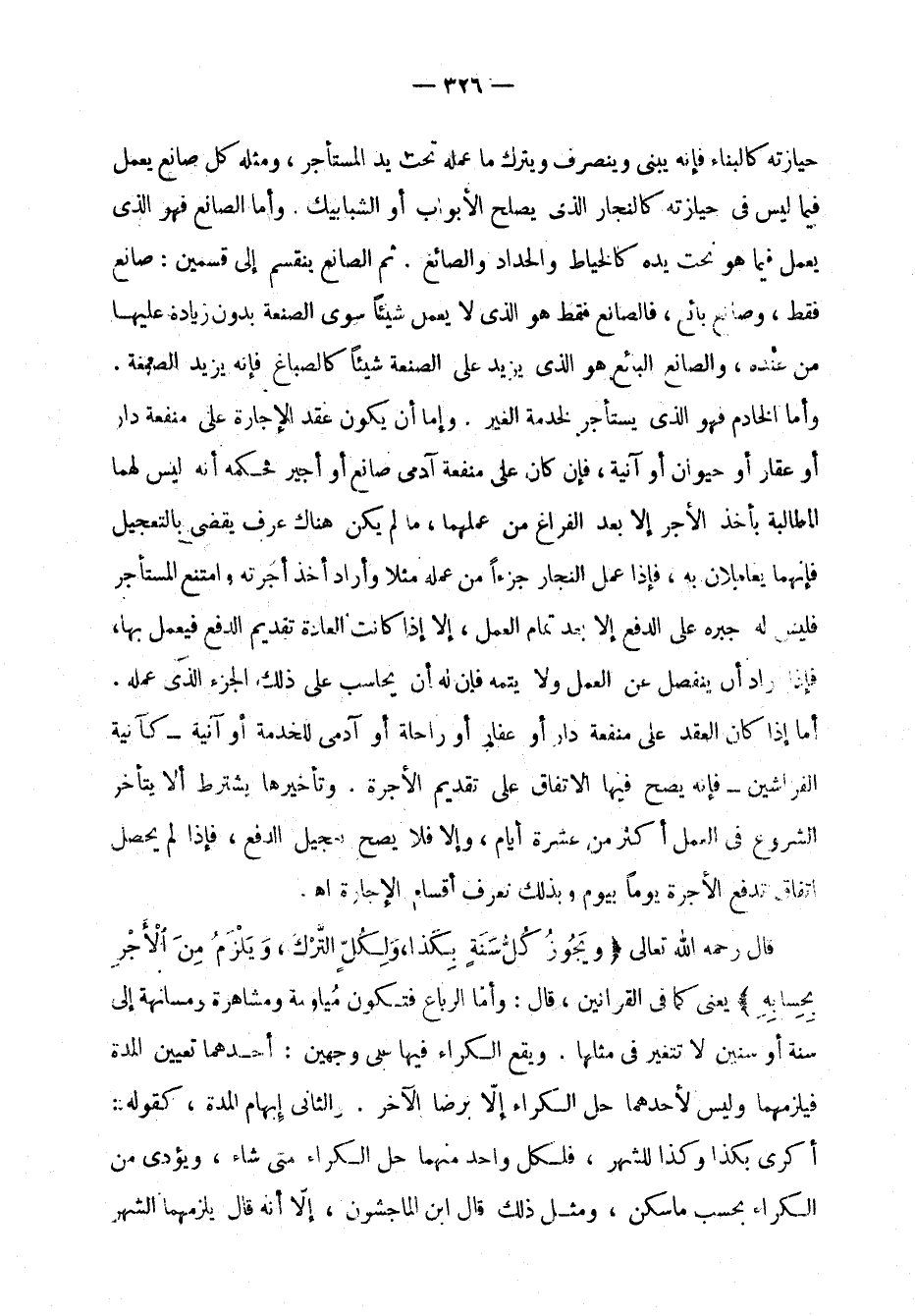 حيازته كالبناء فإنه يبني وينصرف ويترك ما عمله تحت يد المستأجر، ومثله كل صانع يعمل فيما ليس في حيازته كالنجار الذي يصلح الأبواب أو الشبابيك. وأما الصانع فهو الذي يعمل فيما هو تحت يده كالخياط والحداد والصائغ. ثم الصانع ينقسم إلى قسمين: صانع فقط، وصانع بائع، فالصانع فقط هو الذي لا يعمل شيئاً سوى الصنعة بدون زيادة عليها من عنده، والصانع البائع هو الذي يزيد على الصنعة شيئاً كالصباغ فإنه يزيد الصبغة. وأما الخادم فهو الذي يستأجر لخدمة الغير. وإما أن يكون عقد الإجارة على منفعة دار أو عقار أو حيوان أو آنية، فإن كان على منفعة آدمي صانع أو أجير فحكمه أنه ليس لهما المطالبة