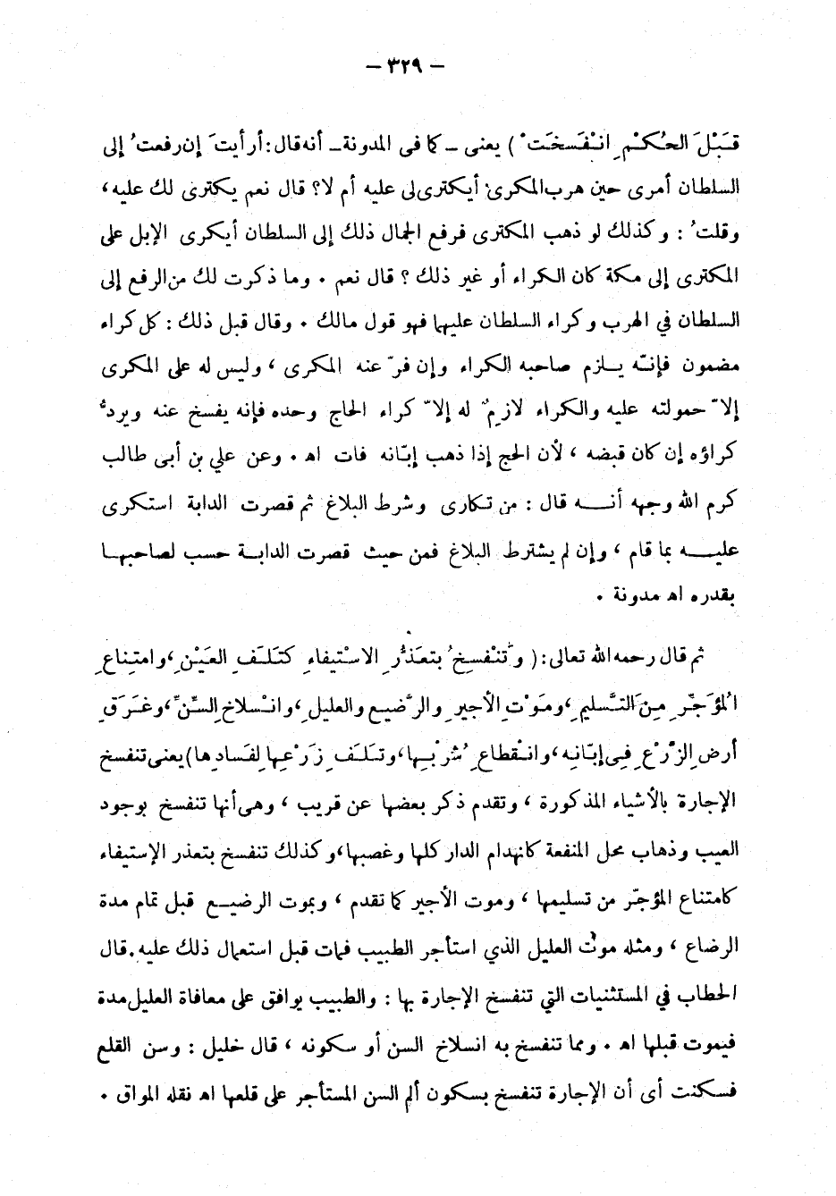وقلت: وكذلك لو ذهب المكتري فرفع الجمال ذلك إلى السلطان أيكري الإبل على المكتري إلى مكة كان الكراء أو غير ذلك؟ قال: نعم. وما ذكرت لك من الرفع إلى السلطان في الهرب وكراء السلطان عليهما فهو قول مالك. وقال قبل ذلك: كل كراء مضمون فإنه يلزم صاحبه الكراء وإن فر عنه المكري، وليس له على المكري إلا حمولته عليه والكراء لازم له إلا كراء الحاج وحده فإنه يفسخ عنه ويرد كراؤه إن كان قبضه، لأن الحج إذا ذهب إبانه فات اهـ. وعن علي بن أبي طالب كرم الله وجهه أنه قال: من تكارى وشرط البلاغ ثم قصرت الدابة استكرى عليه بما قام، وإن لم يشترط البلاغ فمن حيث قصرت الدابة حسب لصاحبها بقدره اهـ المدونة.