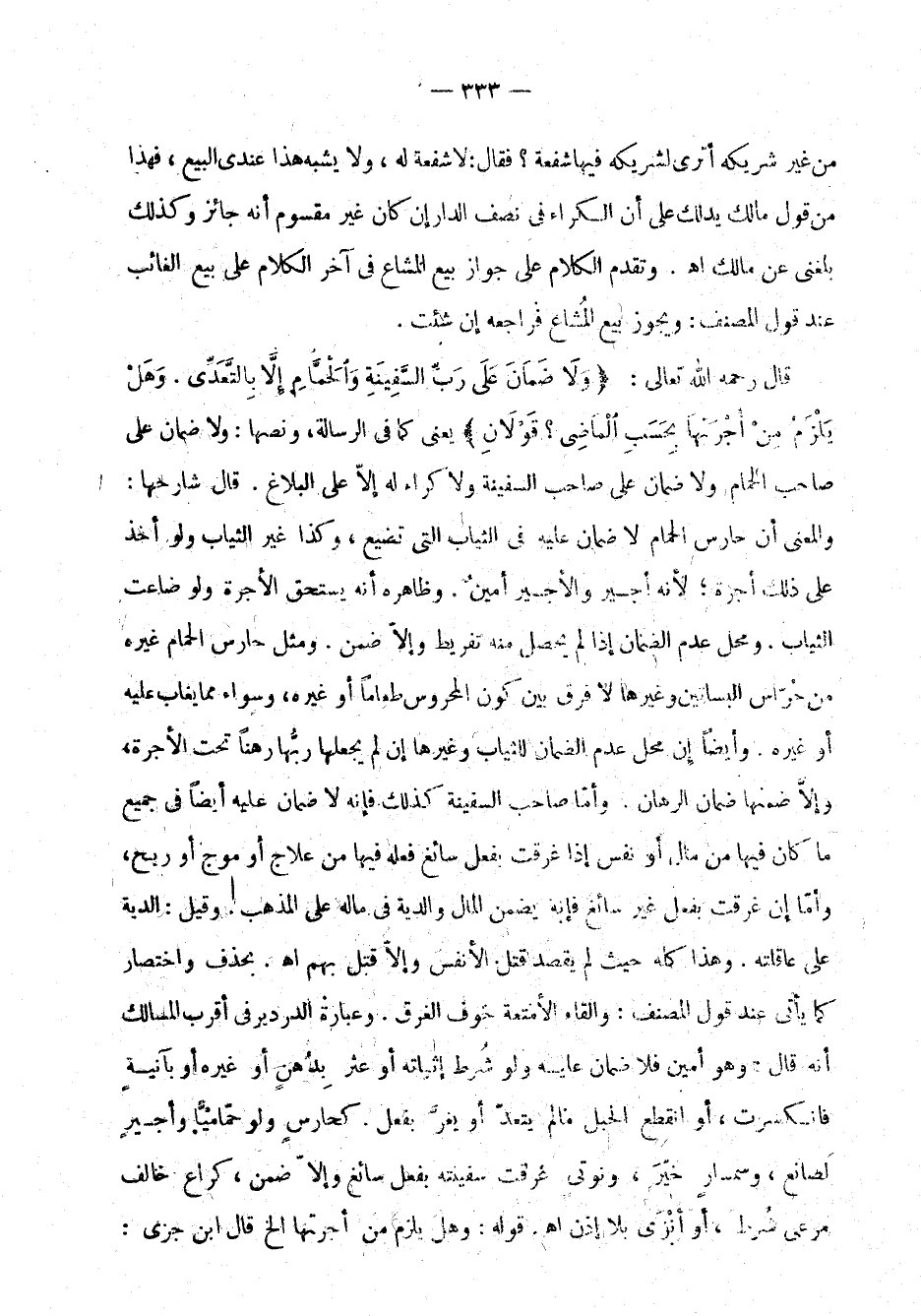 تضيع، وكذا غير الثياب ولو أخذ على ذلك أجرة، لأنه أجير والأجير أمين. وظاهره أنه يستحق الأجرة ولو ضاعت الثياب. ومحل عدم الضمان إذا لم يحصل منه تفريط وإلا ضمن. ومثل حارس الحمام غيره من حراس البساتين وغيرها لا فرق بين كون المحروس طعاماً أو غيره، وسواء مما يغاب عليه أو غيره. وأيضاً إن محل عدم الضمان للثياب وغيرها إن لم يجعلها ربها رهناً تحت الأجرة، و \غلا ضمنها ضمان الرهان. وأما صاحب السفينة كذلك فإنه لا ضمان عليه أيضاً في جميع ما كان فيها من مثال أو نفس إذا غرقت بفعل سائغ فعله فيها من علاج أو موج أو ريح، وأما إن غرقت بفعل غير سائغ فإنه يضمن المال والدية في ماله على المذهب وقيل: الدية على عاقلته. وهذا كله حيث لم يقصد قتل الأنفس وإلا قتل بهم اهـ. بحذف واختصار كما يأتي عند قول المصنف: وإلقاء الأمتعة خوف الغرق. وعبارة الدردير في أقرب المسالك أنه قال: وهو أمين فلا ضمان عليه ولو شرط إثباته أو عثر بدهن أو غيره أو بآنية فانكسرت، أو انقطع الخيل ما لم يتعد أو يغر بفعل. حكارس ولو حمامياً وأجير لصانع، وسمسار خير، ونوتي غرقت سفينته بفعل سائغ وإلا ضمن، كراعٍ خالف مرعى شرط، أو أنزى بلا إذن اهـ. قوله: وهل يلزم من أجرتها إلخ قال ابن جزي: