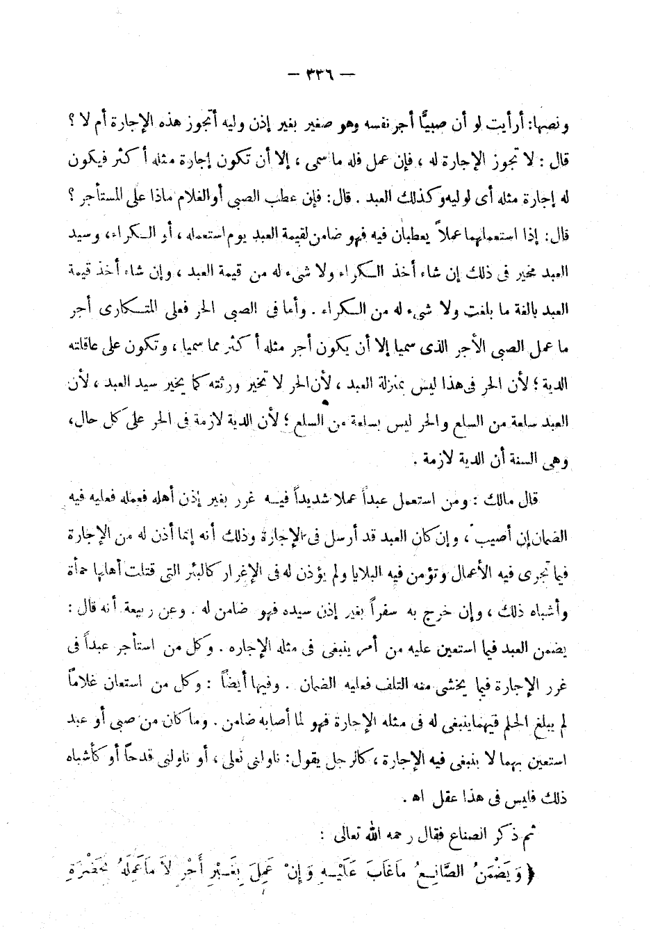ونصها: أرأيت لو أن صبياً أجر نفسه وهو صغير بغير إذن وليه أتجوز هذه الإجارة أم لا؟ قال: لا تجوز الإجارة له، فإن عمل فله ما سمي، إلا أن تكون إجارة مثله أكثر فيكون له إجارة مثله أي لوليه وكذلك العبد. قال: فإن عطب الصبي أو الغلام ماذا على المستأجر؟ قال: إذا استعملهما عملاً يعطبان فيه فهو ضامن لقيمة العبد يوم استعمله، أو الكراء، وسيد العبد مخير في ذلك إن شاء أخذ الكراء ولا شيء له من قيمة العبد، وإن شاء أخذ قيمة العبد بالغة ما بلغت ولا شيء له من الكراء. وأما في الصبي الحر فعلى المتكاري أجر ما عمل الصبي الأجر الذي سميا إلا أن يكون أجر مثله أكثر مما سميا، وتكون على عاقلته الدية، لأن الحر في هذا ليس بمنزلة العبد، لأن الحر لا تخير ورثته كما يخير سيد العبد، لأن العبد سلعة من السلع والحر ليس بسلعة من السلع، لأن الدية لازمة في الحر على كل حال، وهي السنة أن الدية لازمة.