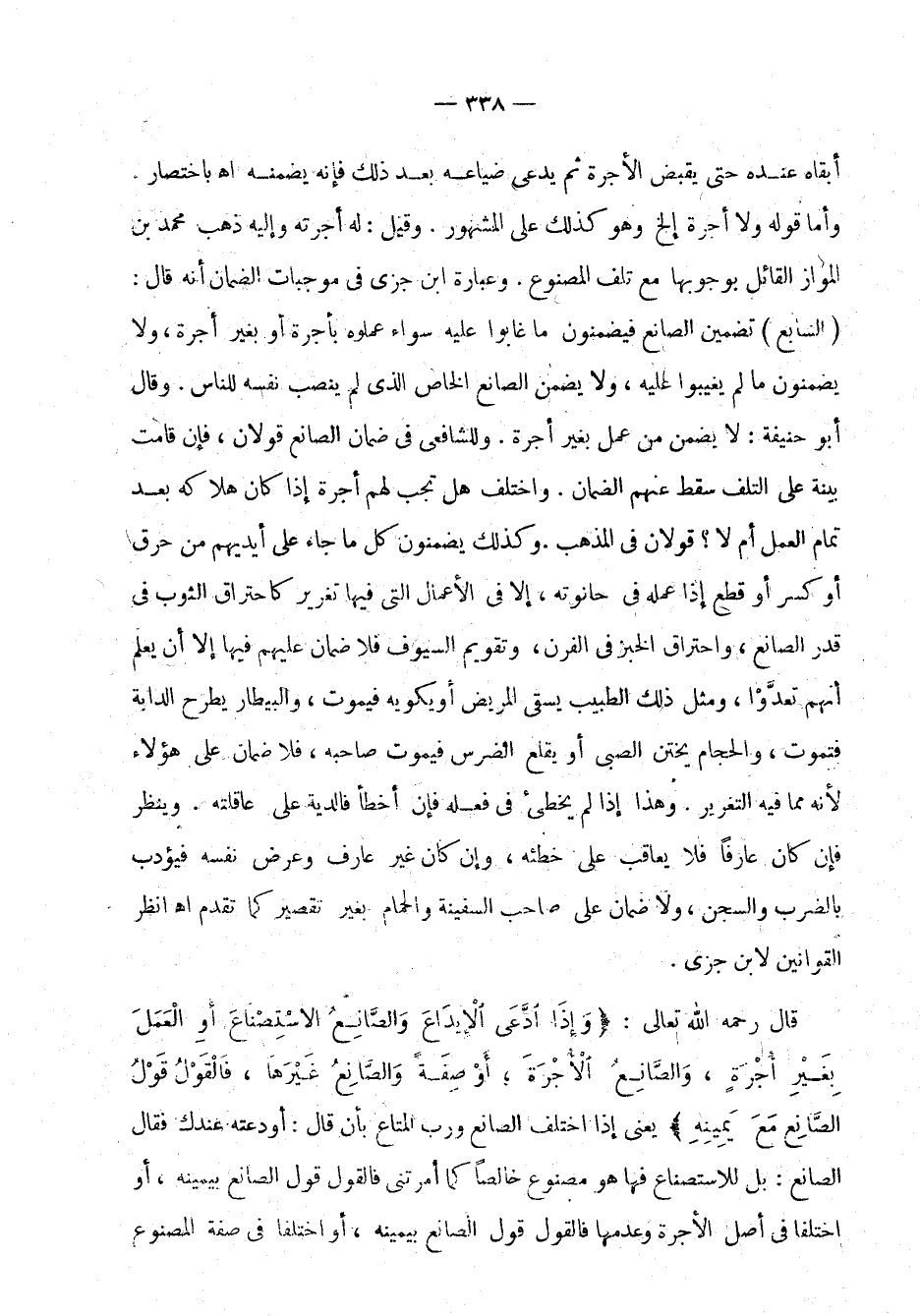 أبقاه عنده حتى يقبض الأجرة ثم يدعي ضياعه بعد ذلك فإنه يضمنه اهـ باختصار وأما قوله ولا أجرة إلخ وهو كذلك على المشهور. وقيل: له أجرته وإليه ذهب محمد بن المواز القائل بوجوبها مع تلف المصنوع. وعبارة ابن جزي في موجبات الضمان أنه قال: (السابع) تضمين الصانع فيضمنون ما غابوا عليه سواء عملوه بأجرة أو بغير أجرة، ولا يضمنون ما لم يغيبوا عليه، ولا يضمن الصانع الخاص الذي لم ينصب نفسه للناس. وقال أبو حنيفة: لا يضمن من عمل بغير أجرة. وللشافعي في ضمان الصانع قولان، فإن قامت بينة على التلف سقط عنهم الضمان. واختلف هل تجب لهم أجرة إذا كان هلاكه بعد تمام العمل أم لا؟ قولان في المذهب. وكذلك يضمنون كل ما جاء على أيديهم من حرق أو كسر أو قطع إذا عمله في حانوته، إلا في الأعمال التي فيها تغرير كاحتراق الثوب في قدر الصانع، واحتراق الخبز في الفرن، وتقويم السيوف فلا ضمان عليهم فيها إلا أن يعلم أنهم تعدوا، ومثل ذلك الطبيب يسقي المريض أو يكويه فيموت، والبيطار يطرح الدابة فتموت، والحجام يختن الصبي أو يقلع الضرس فيموت صاحبه، فلا ضمان على هؤلاء لأنه مما فيه التغرير. وهذا إذا لم يخطئ في فعله فإن أخطأ فالدية على عاقلته وينظر فإن كان عارفاً فلا يعاقب على خطئه، وإن كان غير عارف وعرض نفسه فيؤدب بالضرب والسجن، ولا ضمان على صاحب السفينة والحمام بغير تقصير كما تقدم اهـ انظر القوانين لابن جزي.