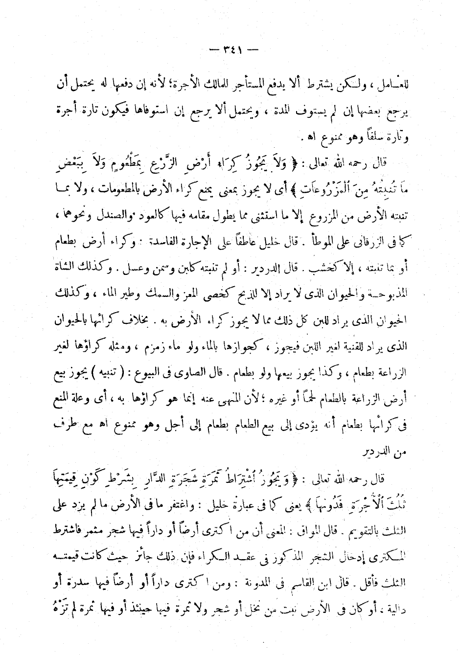 قال رر: " ولا يجوز كراء أرض الزرع بمطعوم ولا ببعض ما تنبته من المزروعات " أي لا يجوز بمعنى يمنع كراء الأرض بالمطعومات، ولا بما تنبته الأرض من المزروع إلا ما استثنى مما يطول مقامه فيها كالعود والصندل ونحوهما، كما في الزرقاني على الموطأ. قال خليل عاطفاً على الإجارة الفاسدة وكراء أرض بطعام أو بما تنبته، إلا كخشب. قال الدردير: أو لم تنبته كلبن وسمن وعسل. وكذلك الشاة المذبوحة والحيوان الذي لا يرى إلا للذبح كخصي المعز والسمك وطير الماء، وكذلك الحيوان الذي يراد للبن كل ذلك مما لا يجوز كراء الأرض به. بخلاف كرائها بالحيوان الذي يراد للقنية لغير اللبن فيجوز، كجوازها بالماء ولو ماء زمزم، ومثله كراؤها لغي الزراعة بطعام، وكذا يجوز بيعها ولو بطعام. قال الصاوي في البيوع.