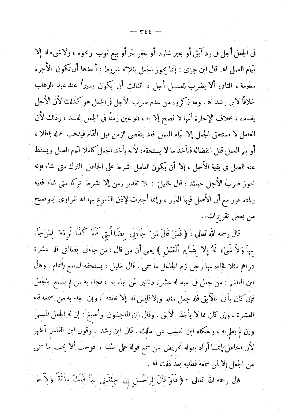في الجعل أجل في رد آبق أو بغير شارد أو حفر بئر أو بيع ثوب ونحوه، ولا شيء له إلا بتمام العمل اهـ. قال ابن جزي: إنما يجوز الجعل بثلاثة شروط: أحدها أن تكون الأجرة معلومة، الثاني: ألا يضرب للعمل أجل، الثالث: أن يكون يسيراً عند عبد الوهاب خلافاً لابن رشد اهـ. وما ذكروه من عدم ضرب الأجل في الجعل هو كذلك لأن الأجل يفسده، بخلاف الإجارة أنها لا تصح إلا به، فلو عين زمناً في الجعل لفسد، وذلك لأن العامل لا يستحق الجعل إلا بتمام العمل فقد