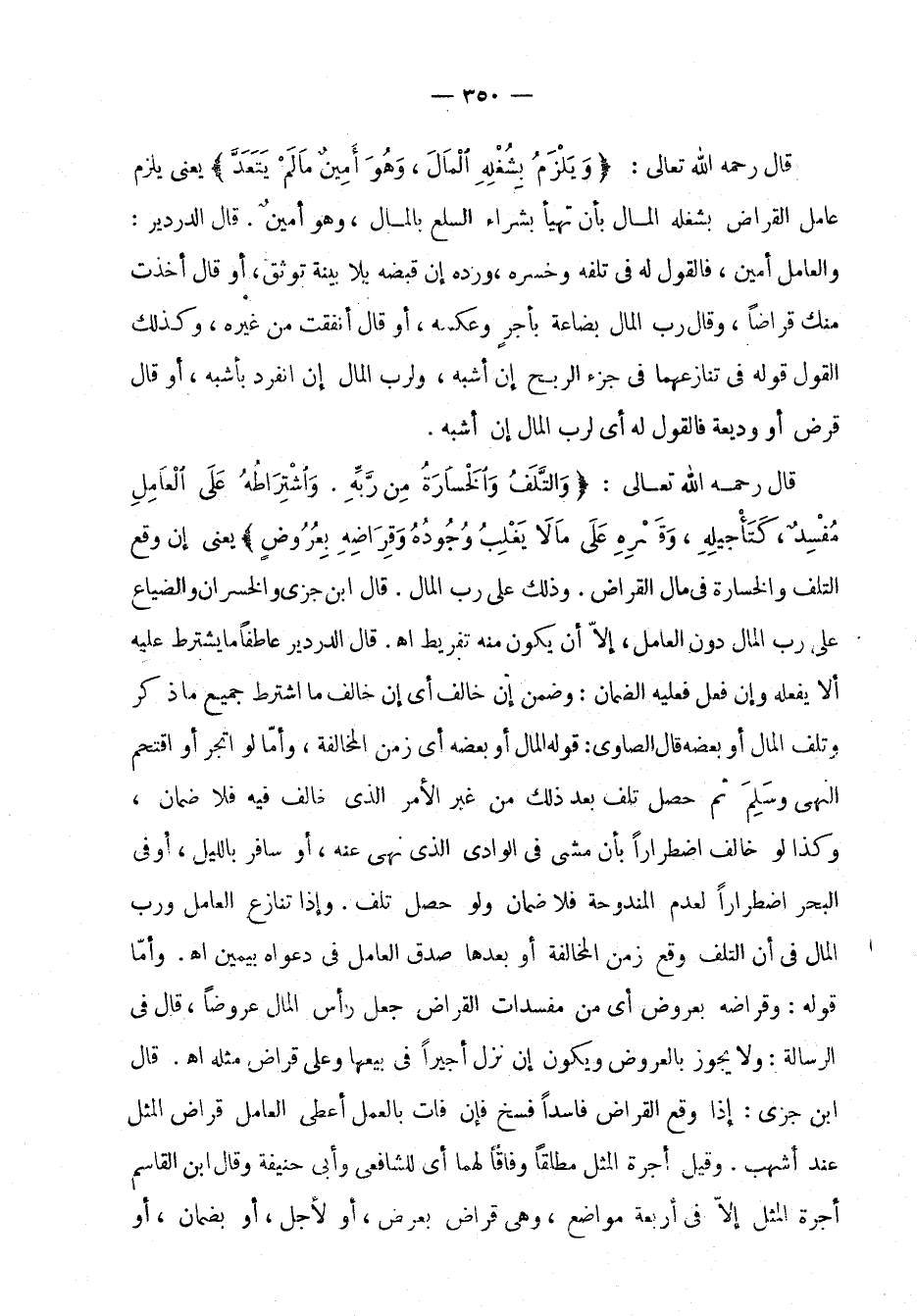 قال رحمه الله تعالى: " والتلف والخسارة من ربه. واشتراطه على التعامل مفسد، كتأجيله، وقسره على ما لا يغلب وجوده وقراضه بعروض " يعني إن وقع التلف والخسارة في مال القراض. وذلك على رب المال. قال ابن جزي والخسران والضياع على رب المال دون العامل، إلا أن يكون منه تفريط اهـ. قال الدردير عاطفاً ما يشترط عليه ألا يفعله وإن فعل فعليه الضمان: وضمن إن خالف أي إن خالف ما اشترط جميع ما ذكر وتلف المال أو بعضه قال الصاوي: قوله المال أو بعضه أي زمن المخالفة، وأما لو اتجر أو اقتحم النهي وسلم ثم حصل تلف بعد ذلك من غير الأمر الذي خالف فيه فلا ضمان، وكذا لو خالف اضطراراً بأن مشى في الوادي الذي نهي عنه، أو سافر بالليل، أو في البحر اضطراراً لعدم المندوحة فلا ضمان ولو حصل تلف. وإذا تنازع العامل ورب المال في أن التلف وقع زمن المخالفة أو بعدها صدق العامل في دعواه بيمين اهـ. وأما قوله: وقراضه بعروض أي من مفسدات القراض جعل رأس المال عروضاً، قال في الرسالة: ولا يجوز بالعروض ويكون إن نزل أجيراً في بيعها وعلى قراض مثله اهـ. قال ابن جزي: إذا وقع القراض فاسداً فسخ فإن فات بالعمل أعطي العامل قراض المثل عند أشهب. وقيل أجرة المثل مطلقاً وفاقاً لهما أي للشافعي وأبي حنيفة وقال ابن القاسم أجرة المثل إلا في أربعة مواضع، وهي قراض بعرض، أو لأجل، أو بضمان، أو