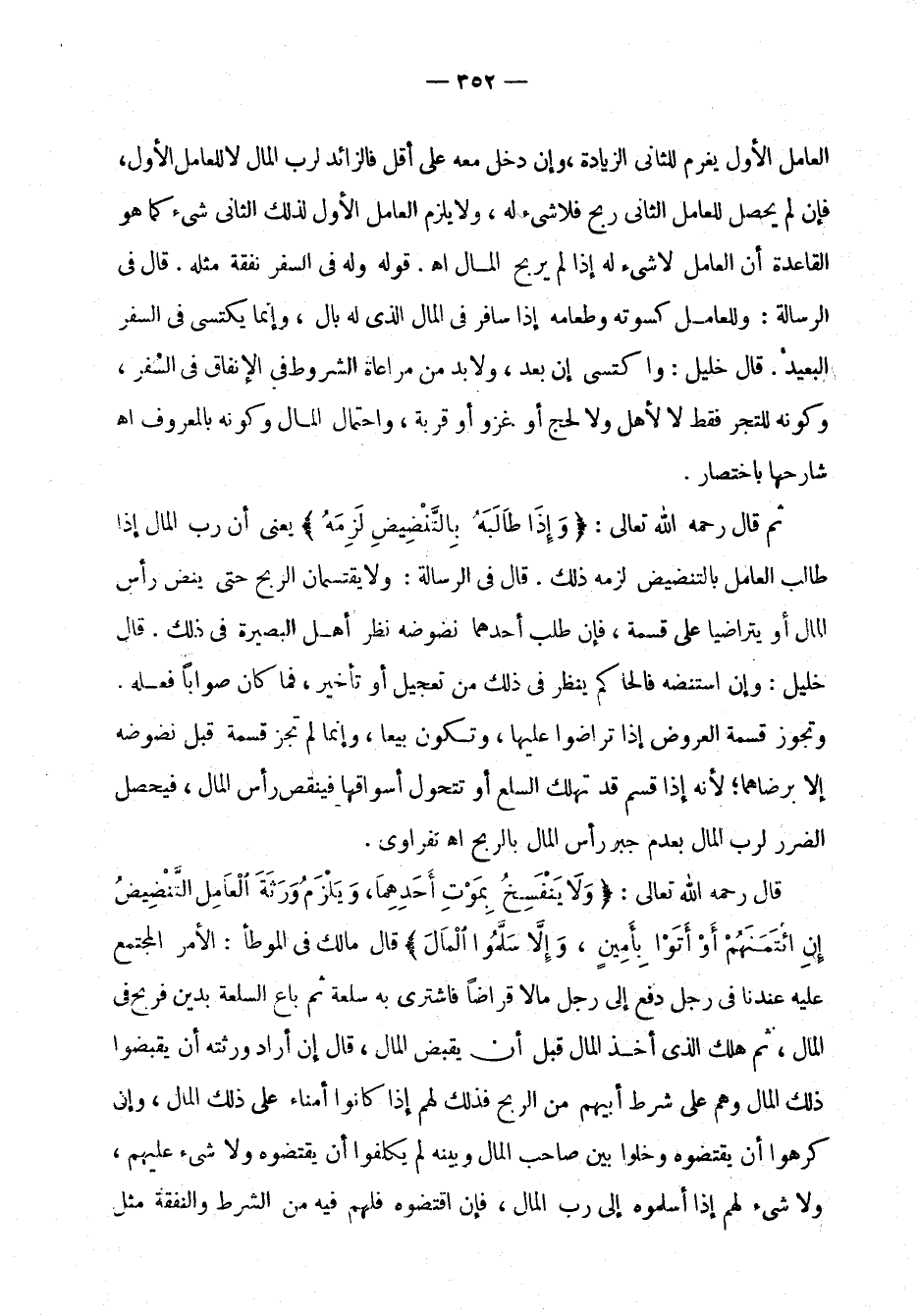 ثم قال رحمه الله تعالى: " وإذا طالبه بالتنضيض لزمه " يعني أن رب المال إذا طالب العامل بالتنضيض لزمه ذلك. قال في الرسالة: ولا يقتسمان الربح حتى ينض رأس المال أو يتراضيا على قسمة، فإن طلب أحدهما نضوضه نظر أهل البصيرة في ذلك. قال خليل: وإن استنضه فالحاكم ينظر في ذلك من تعجيل أو تأخير، فما كان صواباً فعله. وتجوز قسمة العروض إذا تراضوا عليها، وتكون بيعاً، وإنما لم تجز قسمة قبل نضوضه إلا برضاهما؛ لأنه إذا قسم قد تهلك السلع أو تتحول أسواقها فينقص رأس المال، فيحصل الضرر لرب المال بعدم جبر رأس المال بالربح اهـ النفراوي.