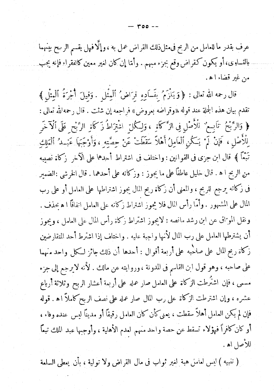 قال رحمه الله تعالى: " ويلزم بفساده قراض المثل. وقيل أجرة المثل " تقدم بيان هذه الجملة عند قوله: " وقراضه بعروض " فراجعه إن شئت. قال رحمه الله تعالى: " والربح تابع للأصل في الزكاة، ولكل اشتراط زكاة الربح على الآخر للأصل، فإن لم يكن العامل أهلاً سقطت عن حصته، وأوجبها عبد الملك تبعاً " قال ابن جزي في القوانين: واختلف في اشتراط أحدهما على الآخر زكاة نصيبه من الربح اهـ. قال خليل عاطفاً على ما يجوز: وزكاته على أحدهما. قال الخرشي: الضمير في زكاته يرجع للربح، والمعنى أن زكاة ربح المال يجوز اشتراطهما على