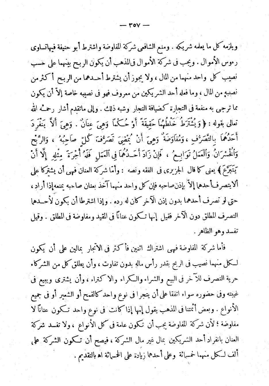 ويلزمه كل ما يعلمه شريكه. ومنع الشافعي شركة المفاوضة واشترط أبو حنيفة فيها تساوي رؤوس الأموال. ويجب في شركة الأموال في المذهب أن يكون الربح بينهما على حسب نصيب كل واحد منهما من المال، ولا يجوز أن يشترط أحدهما من الربح أكثر من نصيبه من المال، وما فعله أحد الشريكين من معروف فهو في نصيبه خاصة إلا أن يكون مما ترجى به منفعة في التجارة كضيافة التجار وشبه ذلك. وإلى ما تقدم أشار رحمه الله تعالى بقوله: " ويشترط خلطهما حقيقة أو حكماً وهي عنان. وهي ألا ينفرد أحدهما بالتصرف، ومفاوضة وهي أن يمضي تصرف كل صاحبه، والربح والخسران والعمل توابع، فإن زاد أحدهما في العمل فله أجرة مثله إلا أن يتبرع " يعني كما قال الجزيري في الفقه ونصه: وأما شركة العنان فهي أن يشتركا على ألا يتصرف أحدهماإلا بإذن صاحبه فإن كل واحد منهما آخذ بعنان صاحبه يمنعه إذا أراد، حتى لو تصرف أحدهما بدون إذن الآخر كان له رده. وإذا اشترطا أن يكون لأحدهما التصرف المطلق دون الآخر فقيل إنها تكون عناناً في المقيد ومفاوضة في المطلق. وقيل تفسد وهو الظاهر.