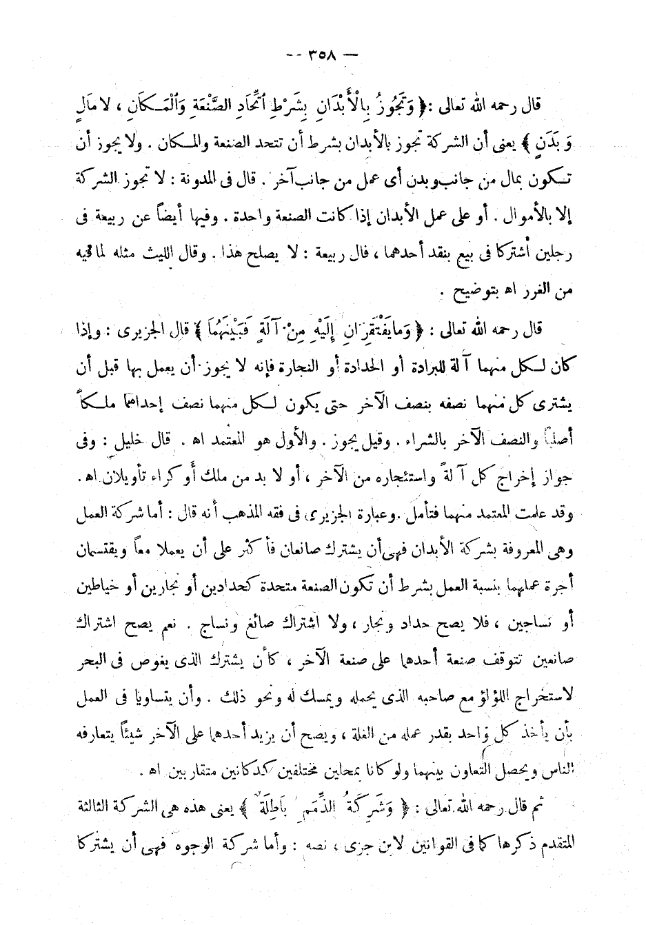 قال رحمه الله تعالى: " وتجوز بالأبدان بشرط اتحاد الصنعة والمكان، لا مال وبدن " يعني أن الشركة تجوز بالأبدان بشرط أن تتحد الصنعة والمكان. ولا يجوز أن تكون بمال من جانب وبدن أي عمل من جانب آخر. قال في المدونة: لا تجوز الشركة إلا بالأموال. أو على عمل الأبدان إذا كانت الصنعة واحدة. وفيها أيضاً عن ربيعة في رجلين اشتركا في بيع بنقد أحدهما، قال ربيعة: لا يصلح هذا. وقال الليث مثله لما فيه من الغرر اهـ بتوضيح.