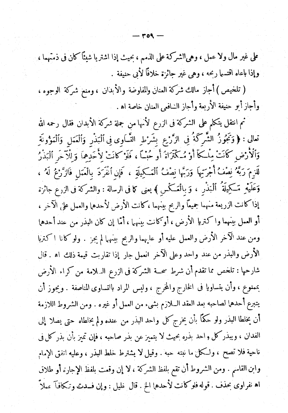 ثم انتقل يتكلم على الشركة في الزرع لأنها من جملة شركة الأبدان فقال رحمه الله تعالى: " وتجوز الشركة في الزرع بشرط التساوي في البذر والعمل والمؤونة والأرض كانت ملكاً أو مكتراة أو حبساً، فلو كانت لأحدهما وللآخر البذر للزم ربه نصف أجرتها وربها نصف المكيلة، فإن انفرد بالعمل فالزرع له، وعليه مكيلة البذر، وبالعكس " يعني كما في الرسالة: والشركة في الزرع جائزة إذا كانت الزريعة منهما جميعاً والربح بينهما، كانت الأرض لأحدهما والعمل على الآخر، أو العمل بينهما واكتريا الأرض، أو كانت بينهما، أما إن كان البذر من عند أحدهما ومن عند الآخر الأرض والعمل عليه أو عليهما والربح بينهما لم يجز. ولو كانا اكتريا الأرض والبذر من عند واحد وعلى الآخر العمل جاز إذا تقاربت قيمة ذلك اهـ. قال شارحها: تلخص مما تقدم أن شرط صحة الشركة في الزرع السلامة