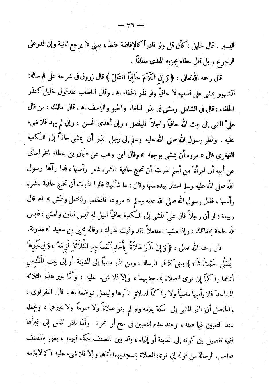قال رحمه الله تعالى: " وإن التزم حافياً انتعل " قال زروق في شرحه على الرسالة: المشهور يمشي على قدميه لا حافياً ولو نذر الحفاء اهـ. وقال الحطاب عند قول خليل كنذر الحفاء: قال في الشامل ومشى في نذر الحفاء والحبو والزحف اهـ. قال مالك: من قال علي المشي إلى بيت الله حافياً راجلاً فلينتعل، وإن أهدى فحسن، وإن لم يهد فلا شيء عليه. ونظر رسول الله صلى الله عليه وسلم إلى رجل نذر أن يمشي حافياً إلى الكعبة القهقرى قال: " مروه أن يمشي بوجهه " وقال ابن وهب عن عثمان بن عطاء الخراساني عن أبيه أن امرأة من أسلم نذرت أن تحج حافية ناشرة شعر رأسها، فلما رآها رسول الله صلى الله عليه وسلم استتر بيده منها وقال: ما شأنها؟ قالوا نذرت أن تحج حافية ناشرة رأسها، فقال رسول الله صلى الله عليه وسلم: " مروها فلتختمر ولتنتعل ولتمش " اهـ قال ربيعة: لو أن رجلاً قال علي المشي إلى الكعبة حافياً لقيل له البس نعلين وامش، فليس لله حاجة بحفائك، وإذا مشيت منتعلاً فقد وفيت نذرك، وقاله يحيى بن سعيد اهـ المدونة.