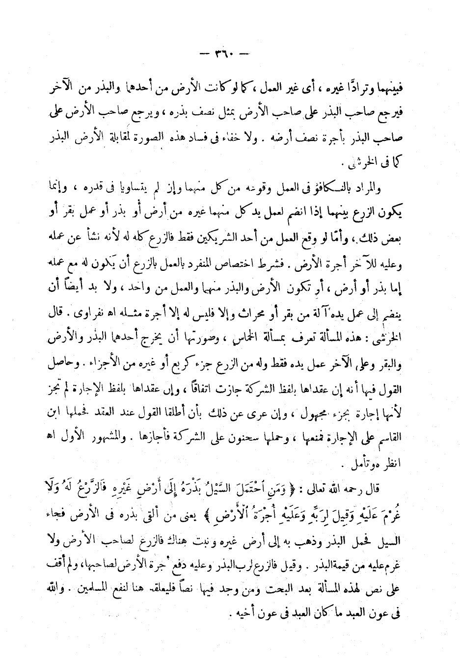 والمراد بالتكافؤ في العمل وقوعه من كل منهما وإن لم يتساويا في قدره، وإنما يكون الزرع بينهما إذا انضم لعمل يد كل منهما غيره من أرض أو بذر أو عمل بقر أو بعض ذلك، وأما لو وقع من أحد الشريكين فقط فالزرع كله له لأنه نشأ عن عمله وعليه للآخر أجرة الأرض. فشرط اختصاص المنفرد بالعمل بالزرع أن يكون له مع عمله إما بذر أو أرض، أو تكون الأرض والبذر منهما والعمل من واحد، ولا بد أيضاً أن ينضم إلى عمل يده آلة من بقر أو محراث وإلا فليس له إلا أجرة مثله اهـ النفراوي. قال الخرشي: هذه المسألة تعرف بمسألة الخماس، وصورتها أن يخرج أحدهما البذر والأرض والبقر وعلى الآخر عمل يده فقط وله من الزرع جزء كربع أو غيره من الأجزاء. وحاصل القول فيها أنه إن عقدها بلفظ الشركة جازت اتفاقاً، وإن عقدها بلفظ الإجارة لم تجز لأنها إجارة بجزء مجهول، وإن عرى عن ذلك بأن أطلقا القول عند العقد فحملها ابن القاسم على الإجارة فمنعها، وحملها سحنون على الشركة فأجازها. والمشهور الأول اهـ انظره وتأمل.
