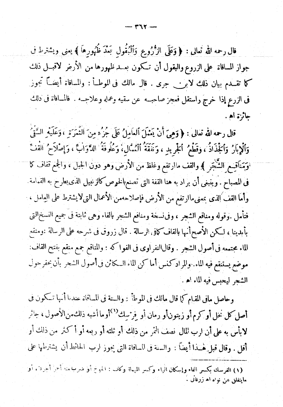 قال رحمه الله تعالى: " وعلى الزروع والبقول بعد ظهورها " يعني ويشترط في جواز المساقاة على الزروع والبقول أن تكون بعد ظهورها من الأرض لا قبل ذلك كما تقدم بيان ذلك لابن جزي. قال مالك في الموطأ: والمساقاة أيضاً تجوز في الزرع إذا خرج واستقل فعجز صاحبه عن سقيه وعمله وعلاجه. فالمساقاة في ذلك جائزة اهـ.
