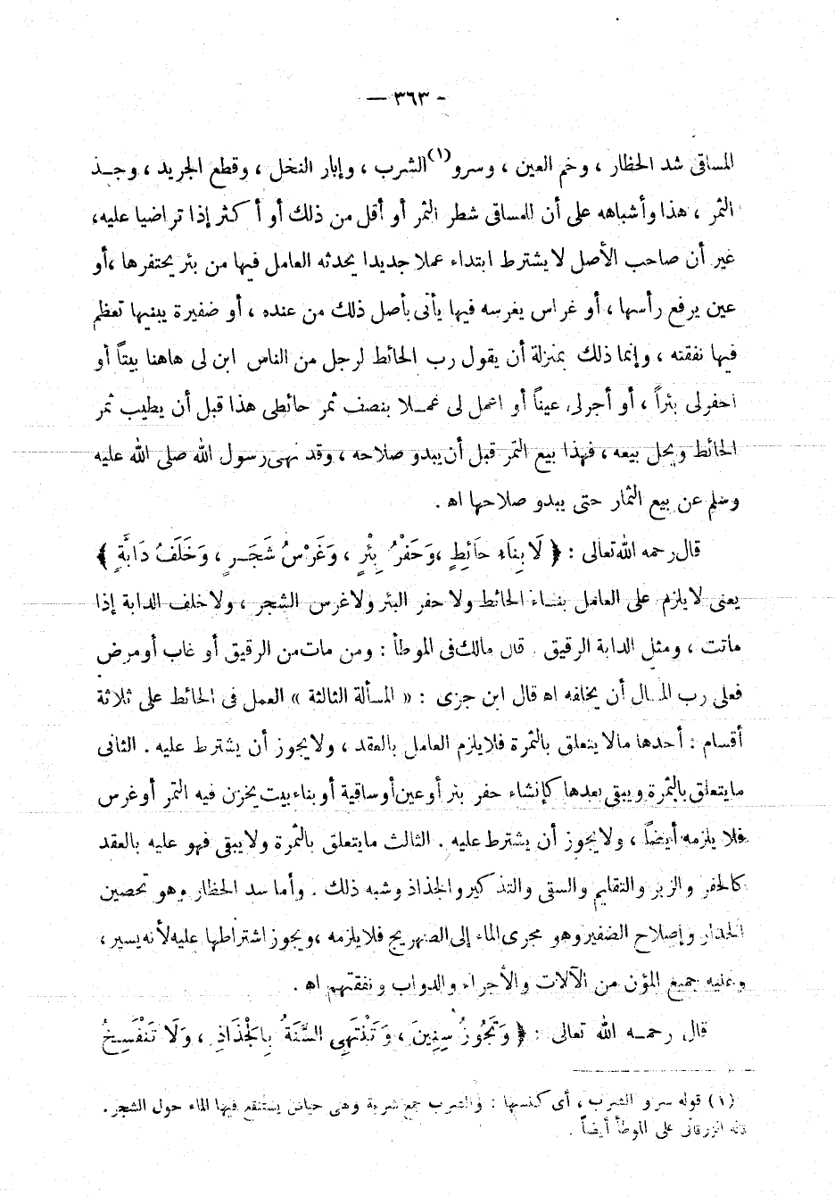 الثالثة: العمل في الحائط على ثلاثة أقسام: أحدها ما لا يتعلق بالثمرة فلا يلزم العامل بالعقد، ولا يجوز أن يشترط عليه. الثاني: ما يتعلق بالثمرة ويبقى بعدها كإنشاء حفر بئر أو عين أو ساقية أو بناء بيت يخزن فيه التمر أو غرس فلا يلزمه أيضاً، ولا يجوز أن يشترط عليه. الثالث: ما يتعلق بالثمرة ولا يبقى فهو عليه بالعقد كالحفر والزبر والتقليم والسقي والتذكير والجذاذ وشبه ذلك. وأما سد الحظار وهو تحصين الجدار وإصلاح الضفير وهو مجرى الماء إلى الصهريج فلا يلزمه، ويجوز اشتراطها عليه لأنه يسير، وعليه جمع المؤن من الآلات والأجزاء والدواب ونفقتهم اهـ.