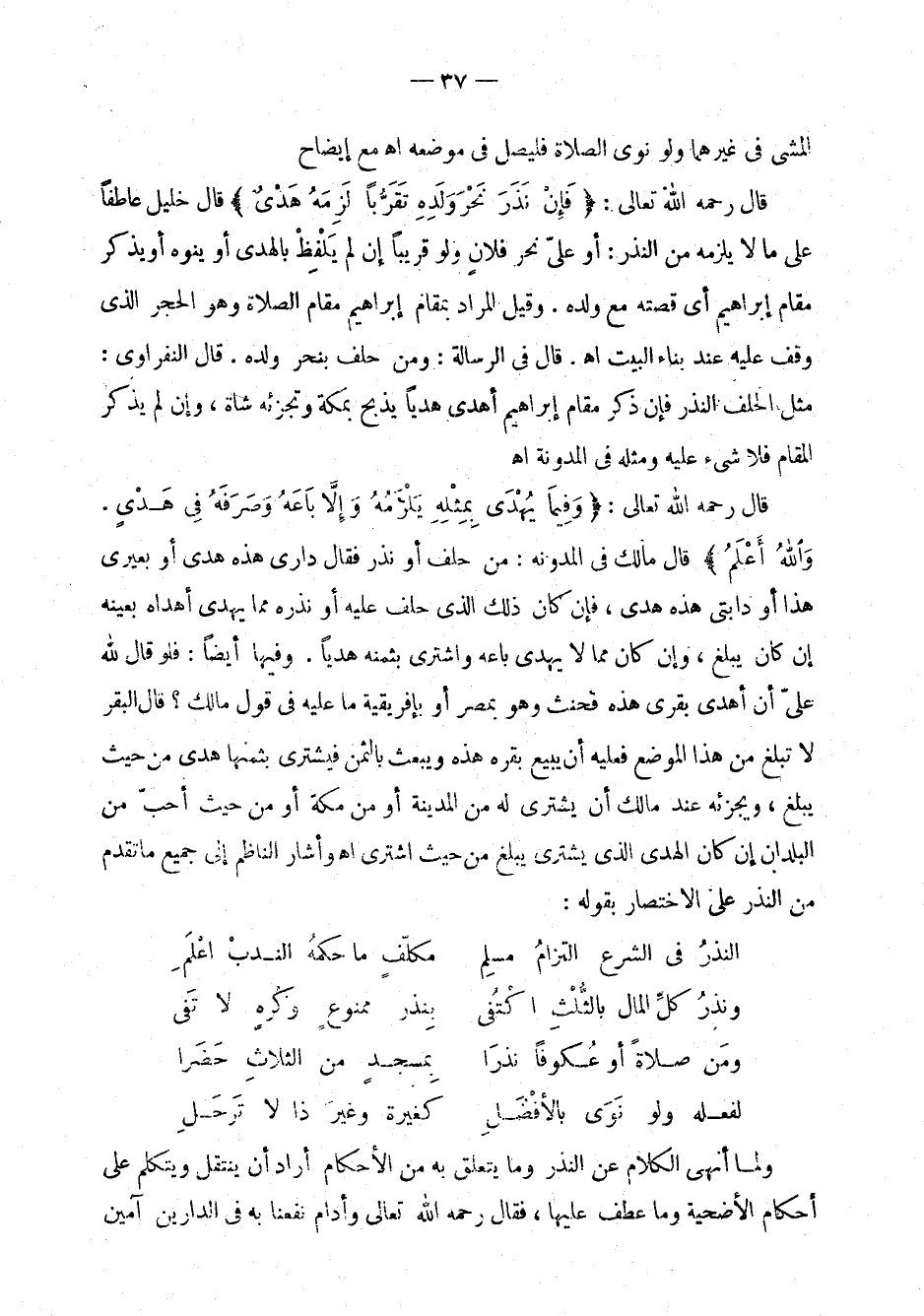 ولده. قال النفراوي: مثل الحلف النذر فإن ذكر مقام إبراهيم أهدى هدياً يذبح بمكة وتجزئه شاة، وإن لم يذكر المقام فلا شيء عليه ومثله في المدونة اهـ.