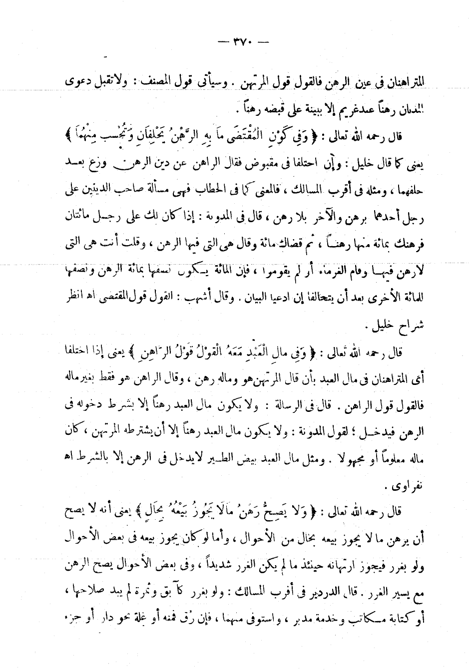 قال رحمه الله تعالى: " وفي مال العبد القول قول الراهن " يعني إذا اختلفا أي المتراهنان في مال العبد بأن قال المرتهن هو وماله رهن، وقال الراهن هو فقط بغير ماله فالقول قول الراهن. قال في الرسالة: ولا يكون مال العبد رهناً إلا بشرط دخوله في الرهن فيدخل، لقوله في المدونة: ولا يكون مال العبد رهناً إلا أن يشترطه المرتهن، كان ماله معلوماً أو مجهولاً. ومثل مال العبد بيض الطير لا يدخل في الرهن إلا بالشرط اهـ. النفراوي.