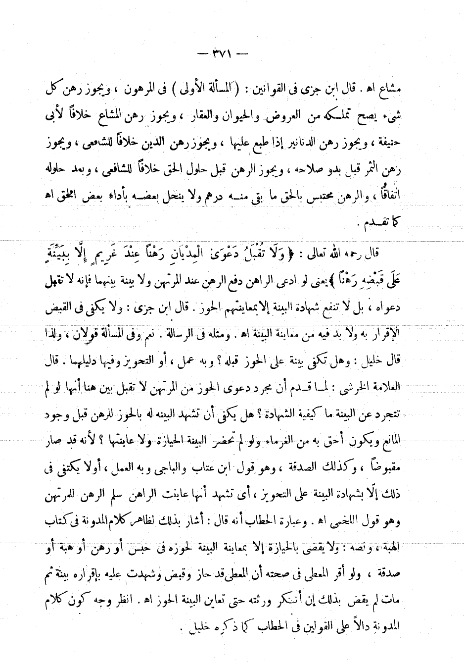 مشاع اهـ. قال ابن جزي في القوانين: (المسألة الأولى) في المرهون، ويجوز رهن كل شيء يصح تملكه من العروض والحيوان والعقار، ويجوز رهن المشاع خلافاً لأبي حنيفة، ويجوز رهن الدنانير إذا طبع عليها، ويجوز رهن الدَّين خلافاً للشافعي، ويجوز رهن الثمر قبل بدو صلاحه، ويجوز الرهن قبل حلول الحق خلافاً للشافعي، وبعد حلوله اتفاقاً، والرهن محتبس بالحق ما بقي منه درهم ولا ينحل بعضه بأداء بعض الحق اهـ. كما تقدم.
