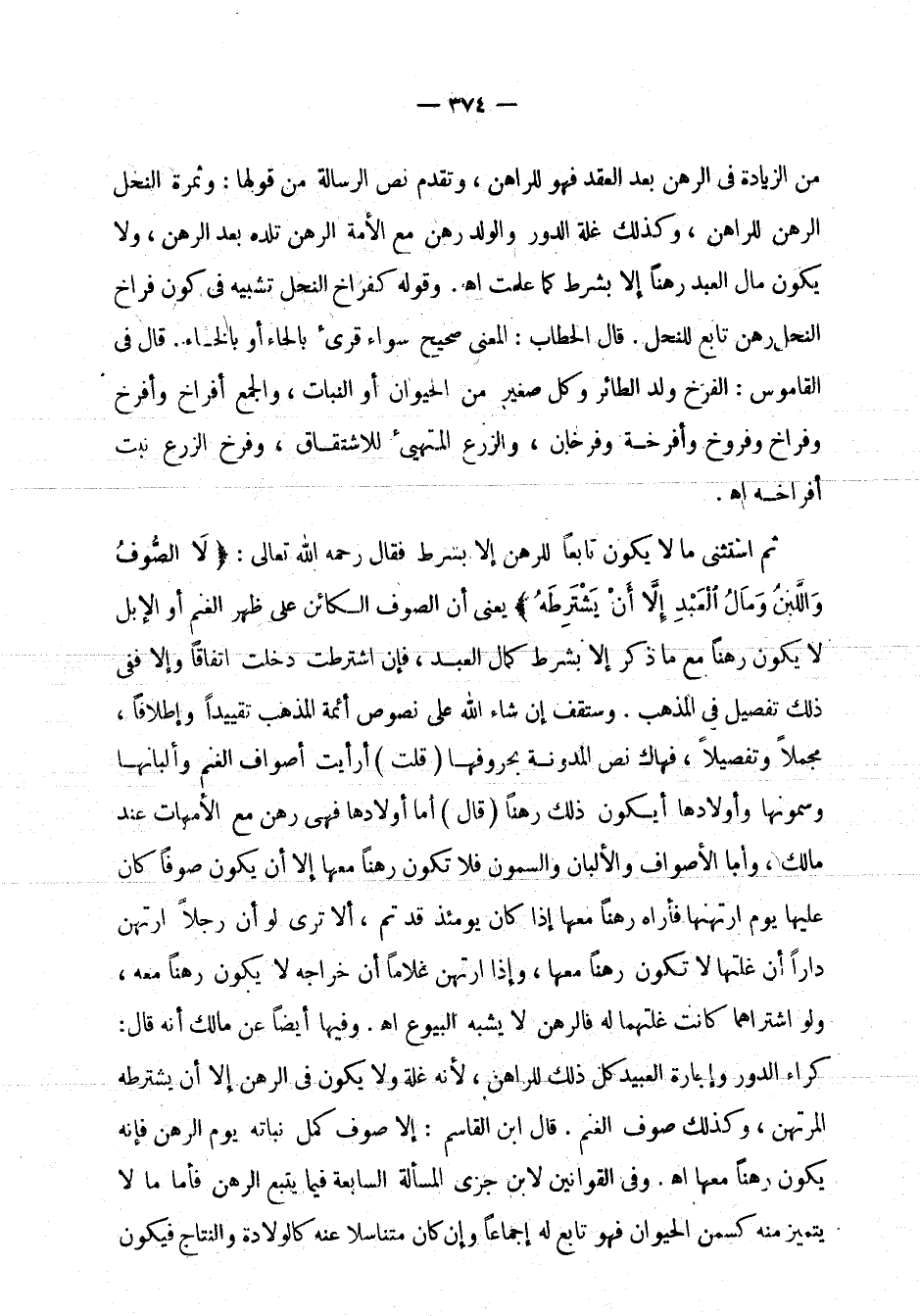 ثم استثنى ما لا يكون تابعاً للرهن إلا بشرط فقال رحمه الله تعالى: " لا الصوف واللبن ومال العبد إلا أن يشترطه " يعني أن الصوف الكائن على ظهر الغنم أو الإبل لا يكون رهناً مع ما ذكر إلا بشرط كمال العبد، فإن اشترطت دخلت اتفاقاً وإلا ففي ذلك تفصيل في المذهب. وستقف إن شاء الله على نصوص أئمة المذهب تقييداً وإطلاقاً، مجملاً وتفصيلاً، فهاك نص المدونة بحروفها قلت: أرأيت أصواف الغنم وألبانها وسمونها وأولادها أيكون ذلك رهناً قال: أما أولادها فهي رهن مع الأمهات عند مالك، وأما الأصواف والألبان والسمون فلا تكون رهناً معها إلا أن يكون صوفاً كان عليها يوم ارتهنها فأراه رهناً معها إذا كان يومئذ قد تم، ألا ترى لو أن رجلاً ارتهن داراً أن غلتها