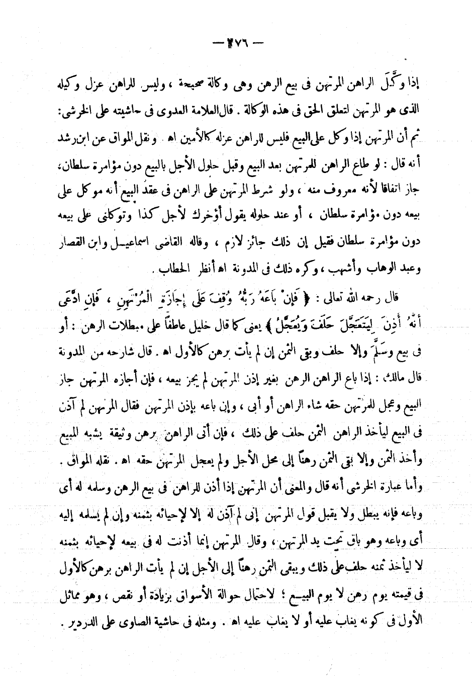 وكل الراهن المرتهن في بيع الرهن وهي وكالة صحيحة، وليس للراهن عزل وكيله الذي هو المرتهن لتعلق الحق في هذه الوكالة. قال العلامة العدوي في حاشيته على الخرشي: ثم إن المرتهن إذا وكل على البيع فليس للراهن عزله كالأمين اهـ. ونقل المواق عن ابن رشد أنه قال: لو طاع الراهن المرتهن بعد البيع وقبل حلول الأجل بالبيع دون مؤامرة سلطان، جاز اتفاقاً لأنه معروف منه، ولو شرط المرتهن على الراهن في عقد البيع أنه موكل على بيعه دون مؤامرة سلطان فقيل إن ذلك جائز لازم، وقاله القاضي اسماعيل وابن القصار وعبد الوهاب وأشهب، وكره ذلك في المدونة اهـ. انظر الحطاب.