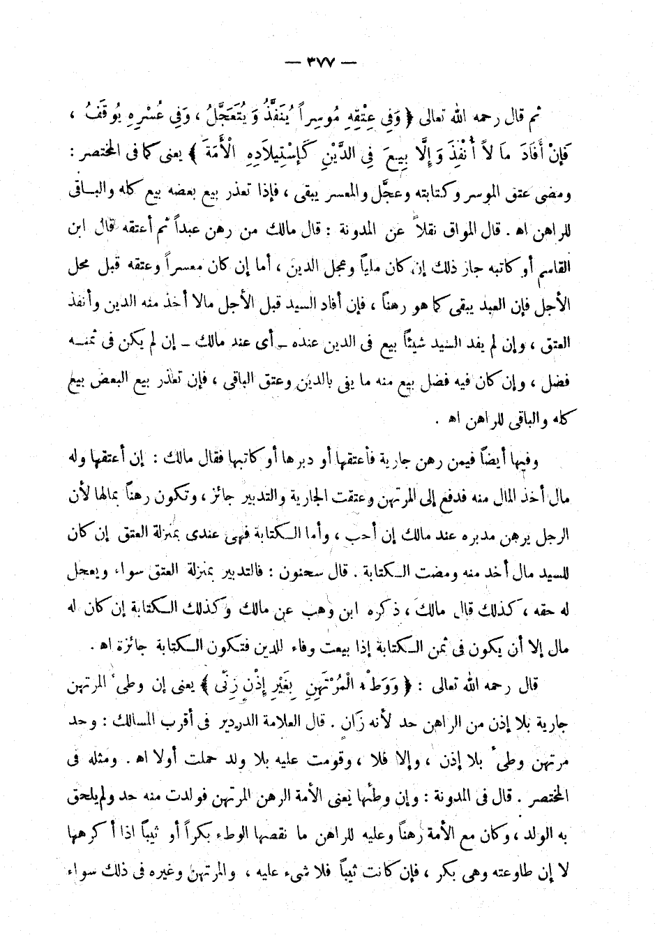 رهن عبد ثم أعتقه قال ابن القاسم أو كاتبه جاز ذلك إن كان ملياً وعجل الدين، أما إن كان معسراً وعتقه قبل محل الأجل فإن العبد يبقى كما هو رهناً، فإن أفاد السيد قبل الأجل مالاً أخذ منه الدين وأنفذ العتق، وإن لم يفد السيد شيئاً بيع في الدين عنده - أي عند مالك - إن لم يكن في ثمنه فضل، وإن كان فيه فضل بيع منه ما يفي بالدين وعتق الباقي، فإن تعذر بيع البعض بيع كله والباقي للراهن اهـ.