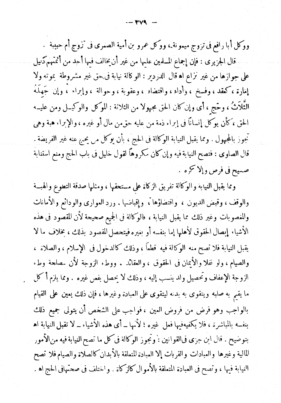 أو بغيره فيتحصل المقصود بذلك، بخلاف ما لا يقبل النيابة فلا تصح منه الوكالة فيه قطعاً، وذلك كالدخول في الإسلام، والصلاة، والصيام، ولو نفلاً، والأيمان في الحقوق، والعقائد، ووطء الزوجة لأن مصلحة وطء الزوجة الإعفاف وتحصيل ولد ينسب إليه، وذلك لا يحصل بفعل غيره. ومما يلزم أكل ما يقيم به صلبه ويتقوى به بدنه ليتقوى على العبادة وغيرها، فإن ذلك يعين على القيام بالواجب وهو فرض من فروض العين، فواجب على الشخص أن يتولى جميع ذلك بنفسه بالمباشرة، فلا يكفيه فيها فعل غيره، لأنها - أي هذه الأشياء - لا تقبل النيابة اهـ. بتوضيح. قال ابن جزي في القوانين: وتجوز الوكالة في كل ما تصح النيابة فيه من الأمور المالية وغيرها والعبادات والقربات إلا العبادة المتعلقة بالأموال كالزكاة. واختلف في صحتها في الحج اهـ.
