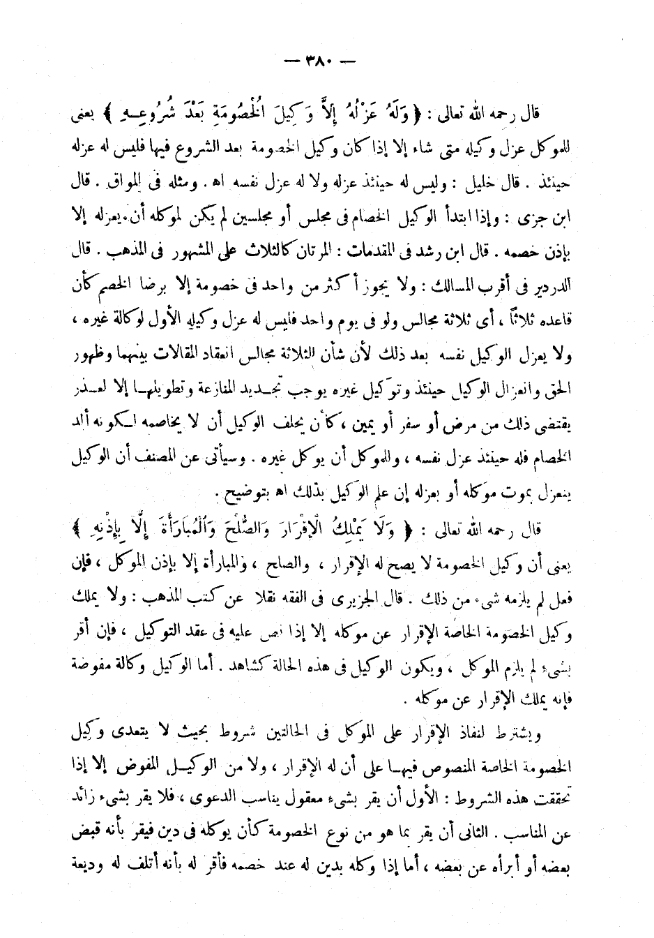 قال رحمه الله تعالى: " وله عزله إلا وكيل الخصومة بعد شروعه " يعني للموكل عزل وكيله متى شاء إلا إذا كان وكيل الخصومة بعد الشروع فيها فليس له عزله حينئذ. قال خليل: وليس له حينئذ عزله ولا له عزل نفسه اهـ. ومثله في المواق. قال ابن جزي: وإذا ابتدأ الوكيل الخصام في مجلس أو مجلسين لم يكن لموكله أن يعزله إلا بإذن خصمه. قال ابن رشد في المقدمات: المرتان كالثلاث على المشهور في المذهب. قال الدردير في أقرب المسالك: ولا يجوز أكثر من واحد في خصومة إلا برضا الخصم كأن قاعده ثلاثاً، أي ثلاثة مجالس ولو في يوم واحد فليس له عزل وكيله الأول لوكالة غيره، ولا يعزل الوكيل نفسه بعد ذلك لأن شأن الثلاثة مجالس انعقاد المقالات بينهما وظهور الحق وانعزال الوكيل حينئذ وتوكيل غيره يوجبه تجديد المنازعة وتطويلها إلا لعذر يقتضي ذلك من مرض أو سفر أو يمين، كأن يحلف الوكيل أن لا يخاصمه لكونه ألد الخصام فله حينئذ عزل نفسه، وللموكل أن يوكل غيره. وسيأتي عن المصنف أن الوكيل ينعزل بموت موكله أو بعزله إن علم الوكيل بذلك اهـ بتوضيح.