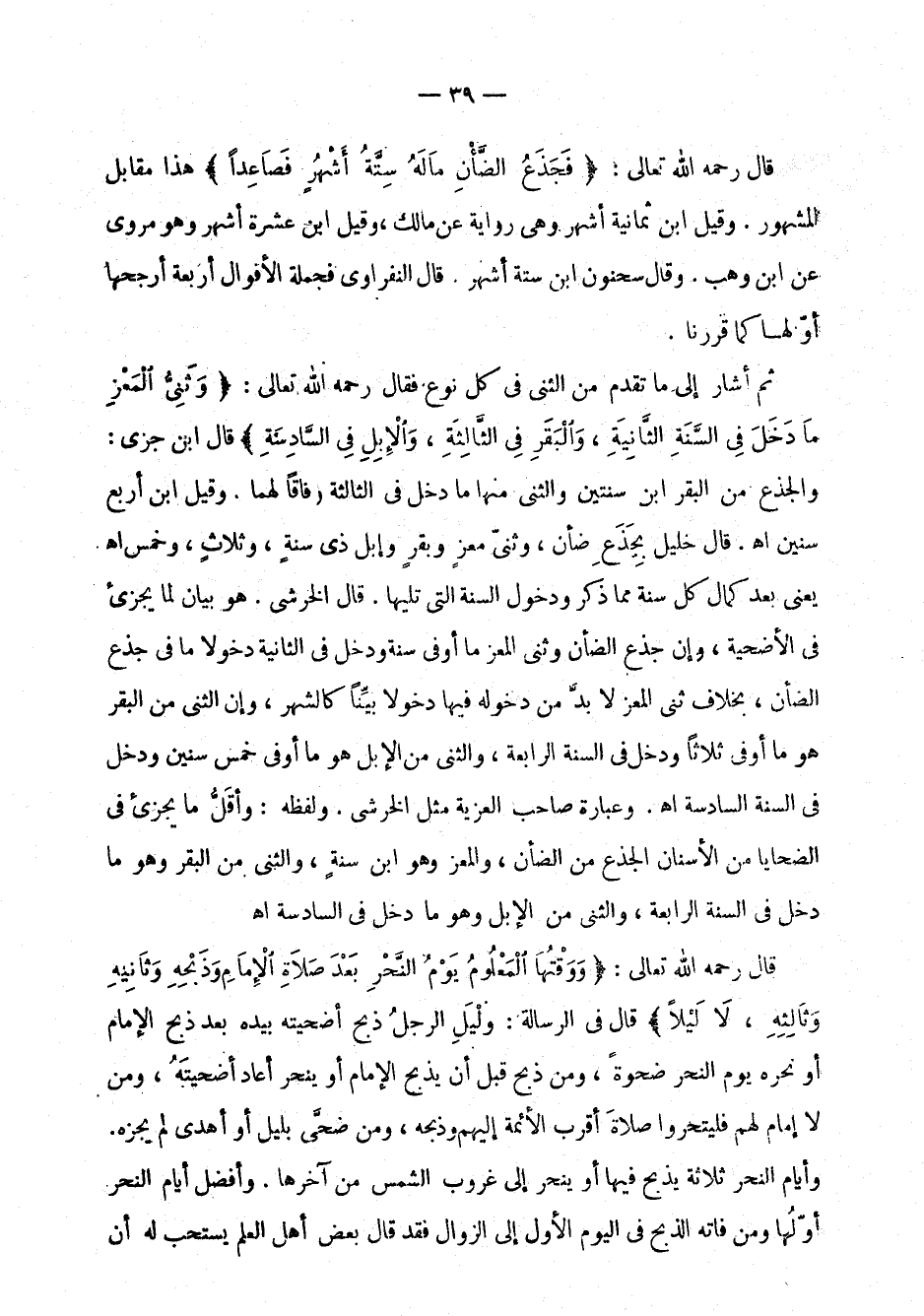ثم أشار إلى ما تقدم من الثني في كل نوع فقال رحمه الله تعالى: " وثني المعز ما دخل في السنة الثانية، والبقر في الثالثة، والإبل في السادسة " قال ابن جزي: والجذع من البقر ابن سنتين والثني منها ما دخل في الثالثة وفاقاً لهما. وقيل ابن أربع سنين اهـ. قال خليل بجذع ضأن، وثني معز وبقر وإبل ذي سنة، وثلاث، وخمس اهـ يعني بعد كمال كل سنة مما ذكر ودخول السنة التي تليها. قال الخرشي: هو بيان لما يجزئ في الأضحية، وإن جذع الضأن وثني المعز ما أوفى سنة ودخل في الثانية دخولاً ما في جذع الضأن، بخلاف ثني المعز لابد من دخوله فيها بيناً كالشهر، وإن الثني من البقر هو ما أوفى ثلاثاً ودخل في السنة الرابعة، والثني من الإبل هو ما أوفى خمس سنين ودخل في السنة السادسة اهـ.