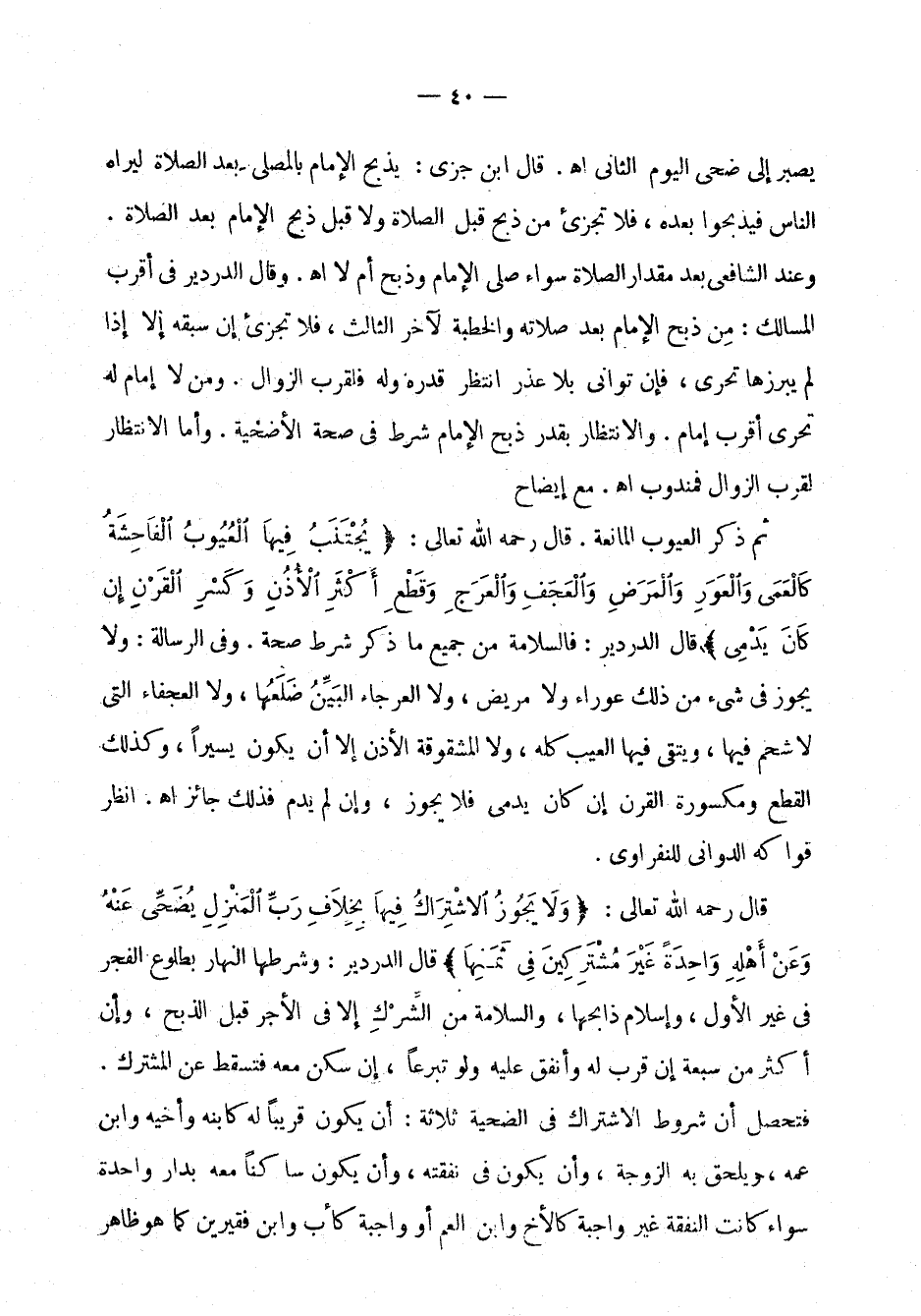 قال رحمه الله تعالى: " ولا يجوز الاشتراك فيها بخلاف رب المنزل يضحي عنه وعن أهله واحدة غير مشتركين في ثمنها " قال الدردير: وشرطها النهار بطلوع الفجر في غير الأول، وإسلام ذابحها، والسلامة من الشرك إلا في الأجر قبل الذبح، وإن أكثر من سبعة إن قرب له وأنفق عليه ولو تبرعاً، إن سكن معه فتسقط عن المشترك. فتحصل أن شروط الاشتراك في الضحية ثلاثة: أن يكون قريباً له كابنه وأخيه وابن عمه، ويلحق به الزوجة، وأن يكون في نفقته، وأن يكون ساكناً معه بدار واحدة سواء كانت النفقة غير واجبة كالأخ وابن العم أو واجبة كأب وابن فقيرين كما هو ظاهر