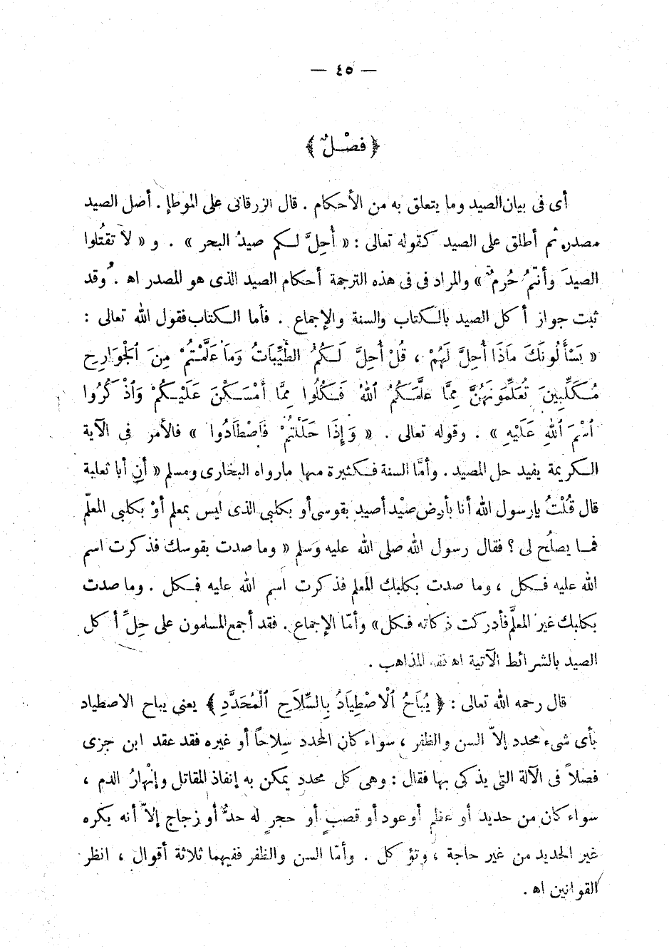 قال رحمه الله تعالى: " يباح الاصطياد بالسلاح المحدد " يعني يباح الاصطياد بأي شيء محدد إلا السن والظفر، سواء كان المحدد سلاحاً أو غيره فقد عقد ابن جزي فصلاً في الآلة التي يذكي بها فقال: وهي كل محدد يمكن به إنفاذ المقاتل وإنهار الدم، سواء كان من حديد أو عظم أو عود أو قصب أو حجر له حد أو زجاج إلا أنه يكره غير الحديد من غير حاجة، وتؤكل. وأما السن والظفر ففيهما ثلاثة أقوال، انظر القوانين اهـ.
