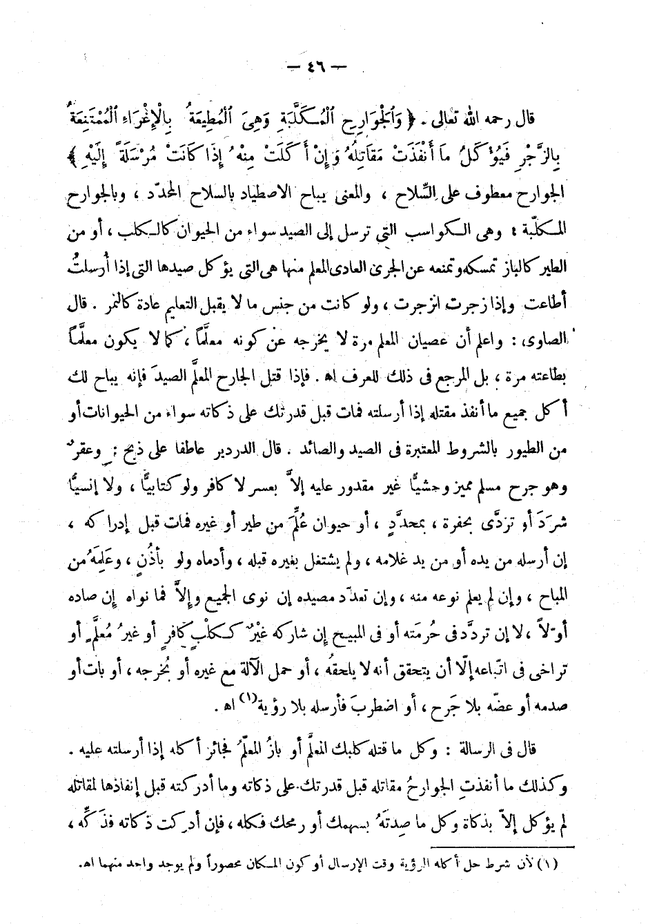 قال رحمه الله تعالى: " والجوارح المكلبة وهي المطيعة بالإغراء الممتنعة بالزجر فيؤكل ما أنفذت مقاتله وإن أكلت منه إذا كانت مرسلة إليه " الجوارح معطوف على السلاح، والمعنى يباح الاصطياد بالسلاح المحدد، وبالجوارح المكلبة، وهي الكواسب التي ترسل إلى الصيد سواء من الحيوان كالكلب، أو من الطير كالباز تمسكه وتكنعه عن الجرى العادى المعلم منها هي التي يؤكل صيدها التي إذا أرسلت أطاعت وإذا زجرت انزجرت، ولو كانت من جنس ما لا يقبل التعليم عادة كالنمر. قال الصاوي: واعلم أن عصيان المعلم مرة لا يخرجه عن كونه معلماً، كما لا يكون معلماً بطاعته مرة، بل المرجع في ذلك للعرف اهـ. فإذا قتل الجارح المعلم الصيد فإنه يباح لك أكل جميع ما أنفذ مقتله إذا أرسلته فمات قبل قدرتك على ذكاته سواء من الحيوانات أو من الطيور بالشروط المعتبرة في الصيد والصائد. قال الدردير عاطفاً على الذبح: وعقر وهو جرح مسلم مميز وحشياً غير مقدور عليه إلا بعسر لا كافر ولو كتابياً، ولا إنسياً شرد أو تردى بحفرة، بمحدد، أو حيوان علم من طير أو غيره فمات قبل إدراكه، إن أرسله من يده أو من يد غلامه، ولم يشتغل بغيره قبله، وأدماه ولو بأذن، وعلمه من المباح، وإن لم يعلم نوعه منه، وإن تعدد مصيده إن نوى الجميع وإلا فما نواه إن صاده أولاً، لا إن تردد في حرمته أو في المبيح إن شاركه غير ككلب كافر أو غير معلم أو تراخى في إتباعه إلا أن يتحقق أنه لا يلحقه، أو حمل الآلة مع غيره أو بخرجه، أو بات أو صدمه أو عضه بلا جرح، أو اضطرب فأرسله بلا رؤية اهـ.