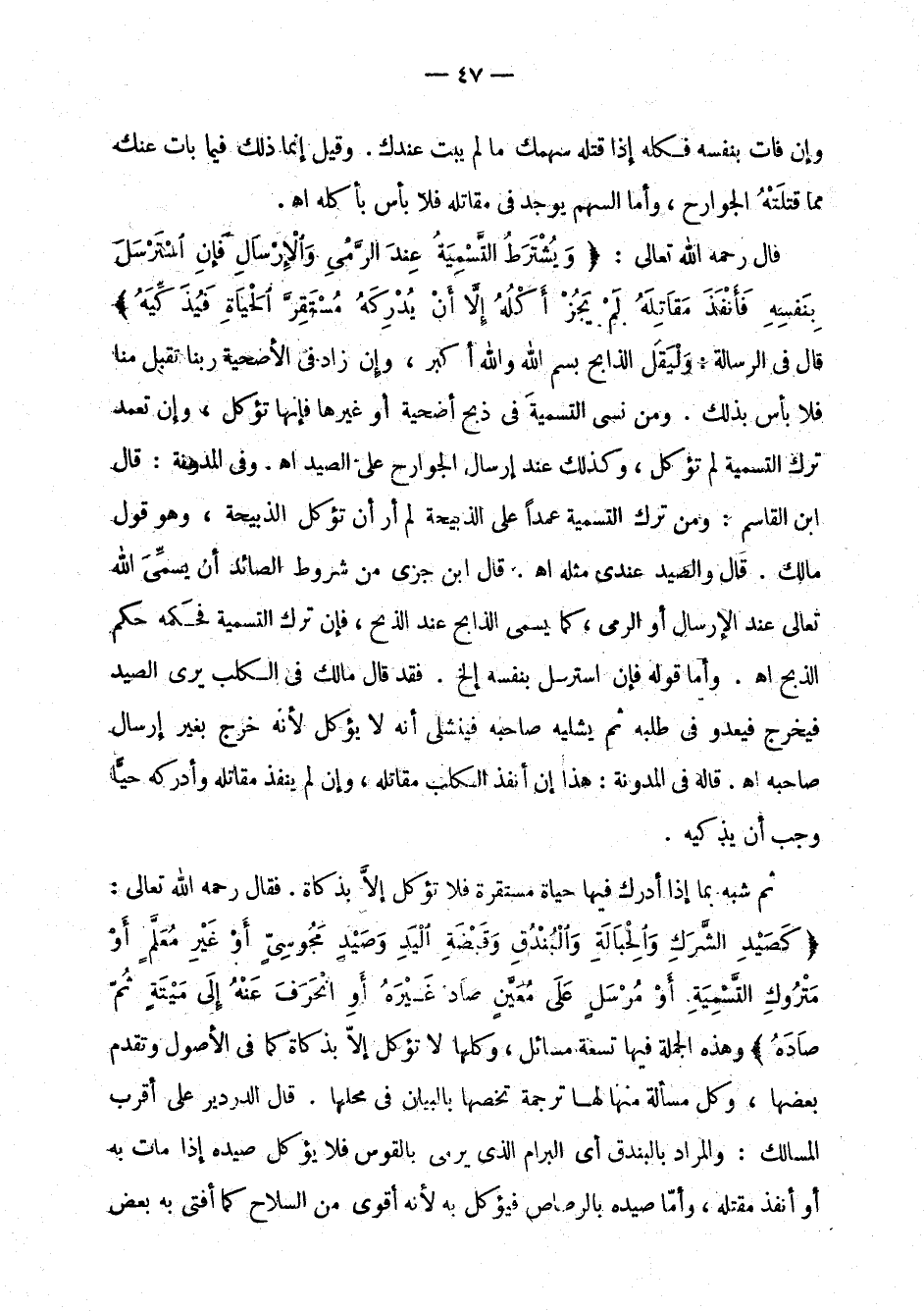 ابن القاسم: ومن ترك التسمية عمداً على الذبيحة لم أر أن تؤكل الذبيحة، وهو قول مالك. قال والصيد عندي مثله اهـ. قال ابن جزي من شروط الصائد أن يسمي الله تعالى عند الإرسال أو الرمي، كما يسمي الذابح عند الذبح. فقد قال مالك في الكلب يرى الصيد فيخرج فيعدو في طلبه ثم يشليه صاحبه فينشلي أنه لا يؤكل لأنه خرج بغير إرسال صاحبه اهـ. قال في المدونة: هذا إن أنفذ الكلب مقاتله، وإن لم ينفذ مقاتله وأدركه حياً وجب أن يذكيه.