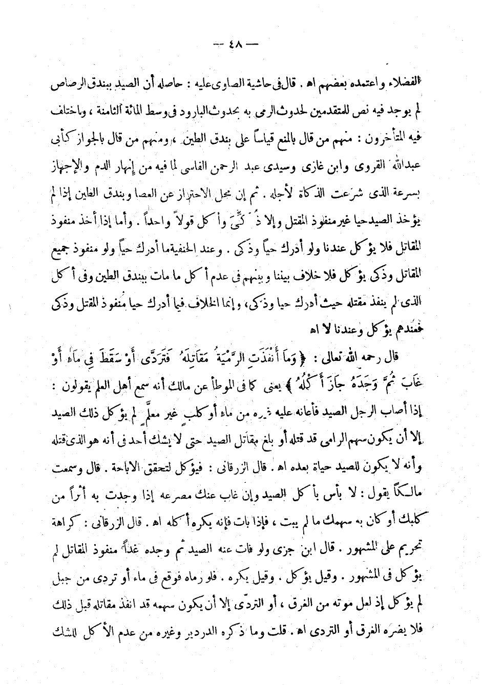 الفضلاء واعتمده بعضهم اهـ. قال في حاشية الصاوي عليه: حاصله ببندق الرصاص لم يوجد فيه نص للمتقدمين لحدوث الرمي به بحدوث البارود في وسط المائة الثامنة، واختلف فيه المتأخرون: منهم من قال بالمنع قياساً على بندق الطين، ومنهم من قال بالجواز كأبي عبد الله القروي وابن غازي وسيدي عبد الرحمن الفاسي لما فيه من إنهار الدم والإجهاز بسرعة الذي شرعت الذكاة لأجله.