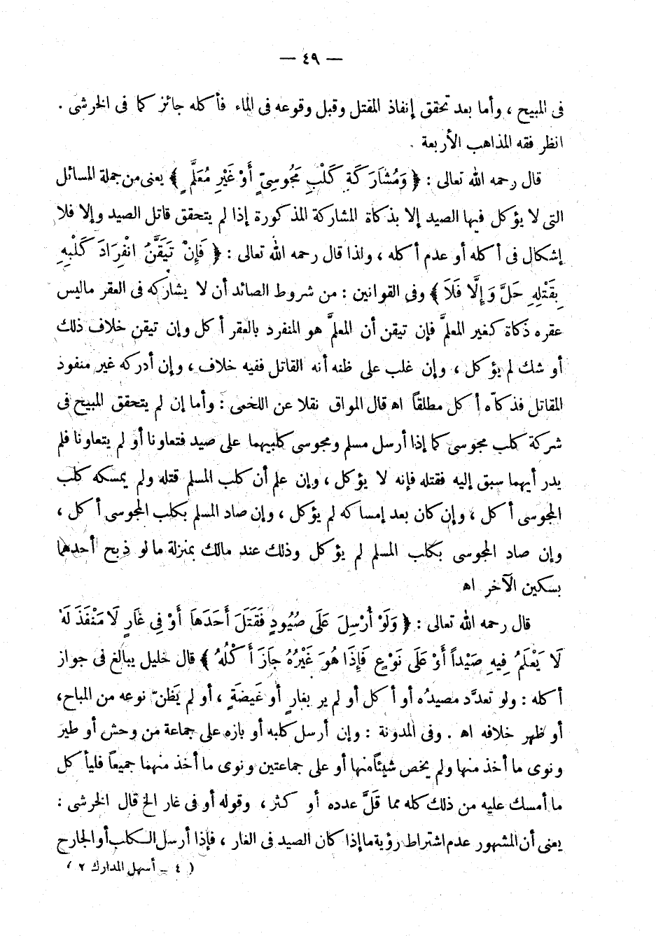 قال رحمه الله تعالى: " ومشاركة كلب مجوسي أو غير معلم " يعني من جملة المسائل التي لا يؤكل فيها الصيد إلا بذكاة المشاركة المذكورة إذا لم يتحقق قاتل الصيد وإلا فلا إشكال في أكله أو عدم أكله، ولذا قال رحمه الله تعالى: " فإن تيقن انفراد كلبه بقتله حل وإلا فلا " وفي القوانين: من شروط الصائد أن لا يشاركه في العقر ما ليس عقره ذكاة كغير المعلم فإن تيقن أن المعلم هو المنفرد بالعقر أكل وإن تيقن خلاف ذلك أو شك لم يؤكل، وإن غلب على ظنه أنه القاتل ففيه خلاف، وإن أدركه غير منفوذ المقاتل فذكاه أكل مطلقاً اهـ قال المواق نقلاً عن اللخمي: وأما إن لم يتحقق المبيح في شركة كلب مجوسي كما إذا أرسل مسلم ومجوسي كلبيهما على صيد فتعاونا أو لم يتعاونا فلم يدر أيهما سبق إليه فقتله فإنه لا يؤكل، وإن علم أن كلب المسلم قتله ولم يمسكه كلب المجوسي أكل، وإن كان بعد إمساكه لم يؤكل، وإن صاد المسلم بكلب المجوسي أكل، وإن صاد المجوسي بكلب المسلم لم يؤكل وذلك عند مالك بمنزلة ما لو ذبح أحدهما بسكين الآخر اهـ.