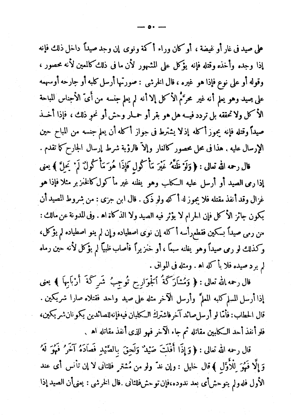 أكمة ونوى إن وجد صيداً داخل ذلك فإنه إذا وجده وأخذه وقتله فإنه يؤكل على المشهور لأن ما في ذلك كالمعين لأنه محصور، وقوله أو على نوع فإذا هو غيره، قال الخرشي: صورتها أرسل كلبه أو جارحه أو سهمه على صيد وهو يعلم أنه غير محرم الأكل إلا أنه لم يعلم جنسه من أي الأجناس المباحة الأكل ولا تحققه بل تردد فيه هل هو بقر أو حمار وحش أو نحو ذلك، فإذا أخذ صيداً وقتله فإنه يجوز أكله إذ لا يشترط في جواز أكله أن يعلم جنسه من المباح حين الإرسال عليه. هذا في محل محصور كالغار وإلا فالرؤية شرط إرسال الجارح كما تقدم.