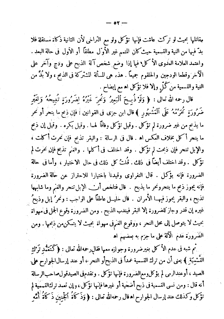 مقاتلها بحيث لو تركت عاشت فإنها تؤكل ولو مع التراخي لأن الثانية ذكاة مستقلة فلابد فيها من النية والتسمية حيث كان المتمم غير الأول مطلقاً أو الأول في حالة البعد. واعتمد العلامة العدوي الأكل فيما إذا وضع شخص آلة الذبح على ودج وآخر على الآخر وقطعا الودجين والحلقوم جميعاً. هذه هي المسألة المشتركة في الذبح، ولابد من النية والتسمية من كل وإلا فلا تؤكل اهـ مع إيضاح.