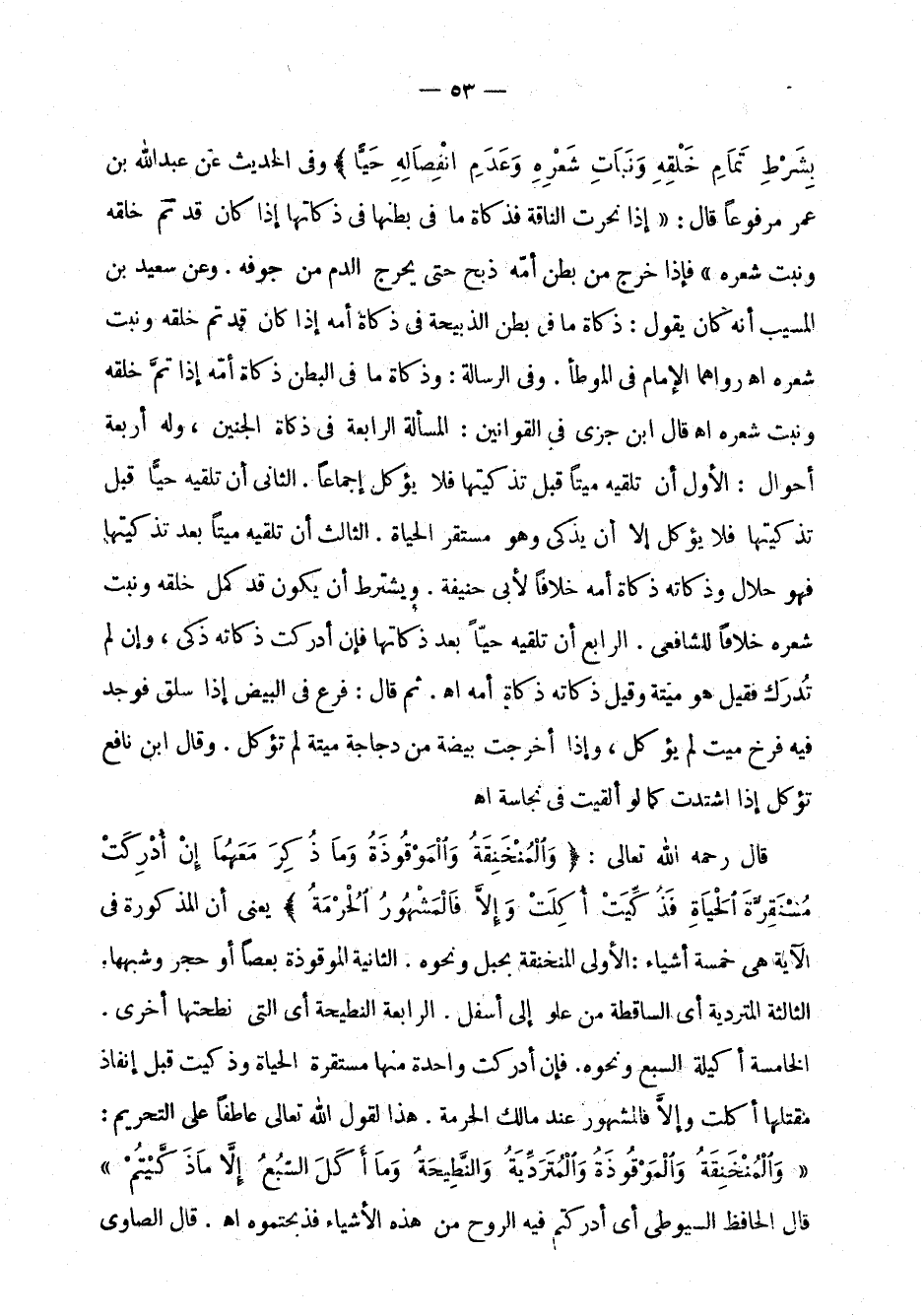بشرط تمام خلقه ونبات شعره وعدم انفصاله حياً " وفي الحديث عن عبد الله بن عمر مرفوعاً قال: " إذا نحرت الناقة فذكاة ما في بطنها في ذكاتها إذا كان قد تم خلقه ونبت شعره " فإذا خرج من بطن أمه ذبح حتى يخرج الدم من جوفه. وعن سعيد بن المسيب أنه كان يقول: ذكاة ما في بطن الذبيحة في ذكاة أمه إذا كان قد تم خلقه ونبت شعره اهـ رواهما الإمام في الموطأ. وفي الرسالة: وذكاة ما في البطن ذكاة أمه إذا تم خلقه ونبت شعره اهـ قال ابن جزي في القوانين: المسألة الرابعة في ذكاة الجنين، وله أربع أحوال: الأولى أن تلقيه ميتاً قبل تذكيتها فلا يؤكل إجماعاً. الثانية أن تلقيه حياً قبل تذكيتها فلا يؤكل إلا أن يذكى وهو مستقر الحياة. الثالثة أن تلقيه ميتاً بعد تذكيتها فهو حلال وذكاته ذكاة أمه خلافاً لأبي حنيفة. ويشترط أن يكون قد كمل خلقه ونبت شعره خلافاً للشافعي. الرابعة أن تلقيه حياً بعد ذكاتها فإن أدركت ذكاته ذكى، وإن لم تدرك فقيل هو ميتة وقيل ذكاته ذكاة أمه اهـ. ثم قال: فرع في البيض إذا سلق فوجد فيه فرخ ميت لم يؤكل، وإذا أخرجت بيضة من دجاجة ميت لم تؤكل. وقال ابن نافع تؤكل إذا اشتدت كما لو ألقيت في نجاسة اهـ.