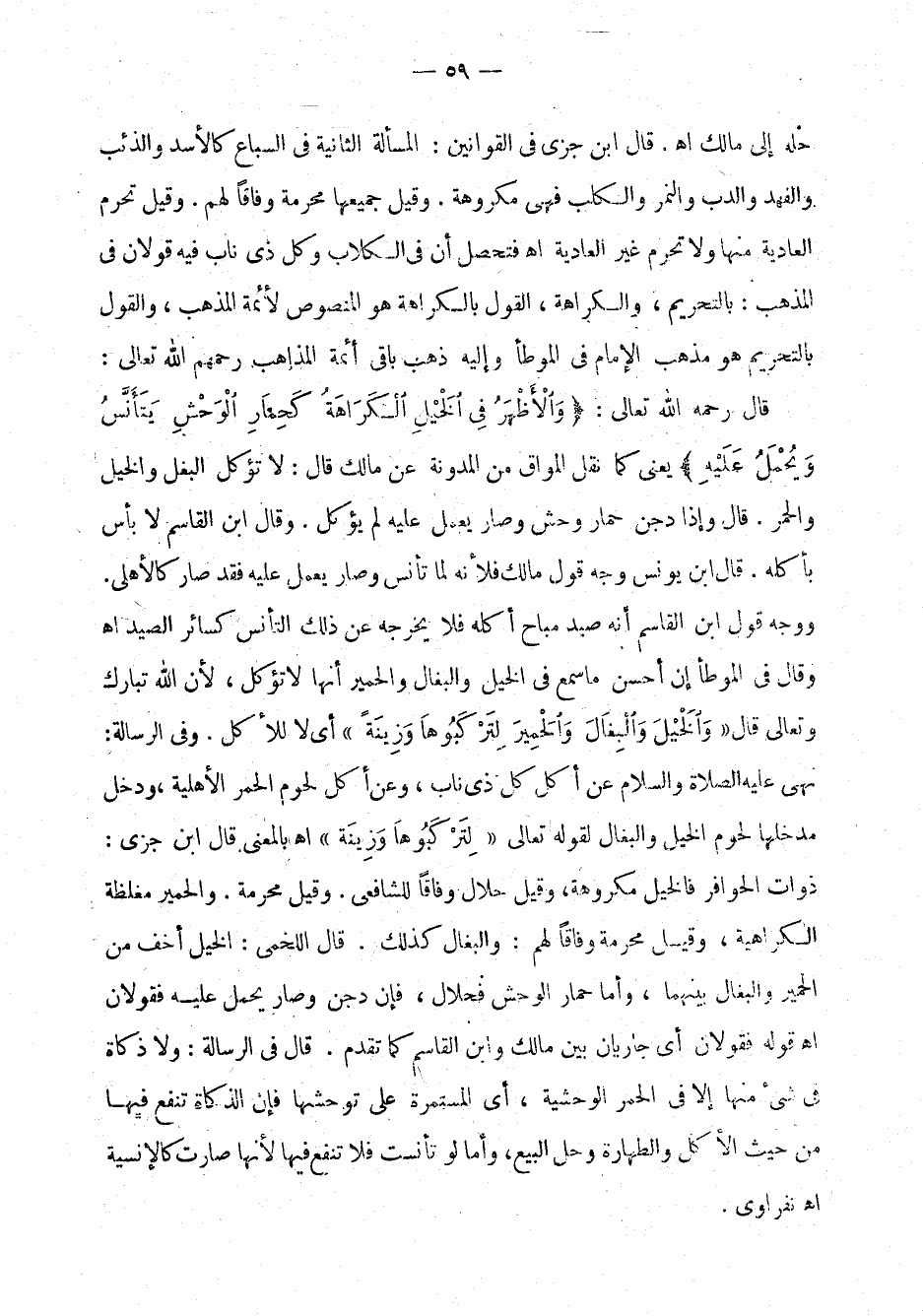 لتركبوها وزينة} [النحل: 8] أي لا للأكل. وفي الرسالة: نهى عليه الصلاة والسلام عن أكل كل ذي ناب، وعن أكل لحوم الحمر الأهلية، ودخل مدخلها لحوم الخيل والبغال لقوله تعالى {لتركبوها وزينة} اهـ بالمعنى قال ابن جزي: ذوات الحوافر فالخيل مكروهة، وقيل حلال وفاقاً للشافعي. وقيل محرمة. والحمير مغلظة الكراهية، وقيل محرمة وفاقاً لهم. والبغال كذلك. قال اللخمي: الخيل أخف من الحمير والبغال بينهما، وأما الحمار الوحش فحلال، فإن دجن وصار يحمل عليه فقولان أي جاريان بين مالك وابن القاسم كما تقدم. قال في الرسالة: ولا ذكاة في شيء منها إلا في الحمر الوحشية، أي المستمرة على توحشها فإن الذكاة تنفع فيها من حيث الأكل والطهارة وحل البيع، وأما لو تأنست فلا تنفع فيها لأنها صارت كالإنسية اهـ النفراوي.