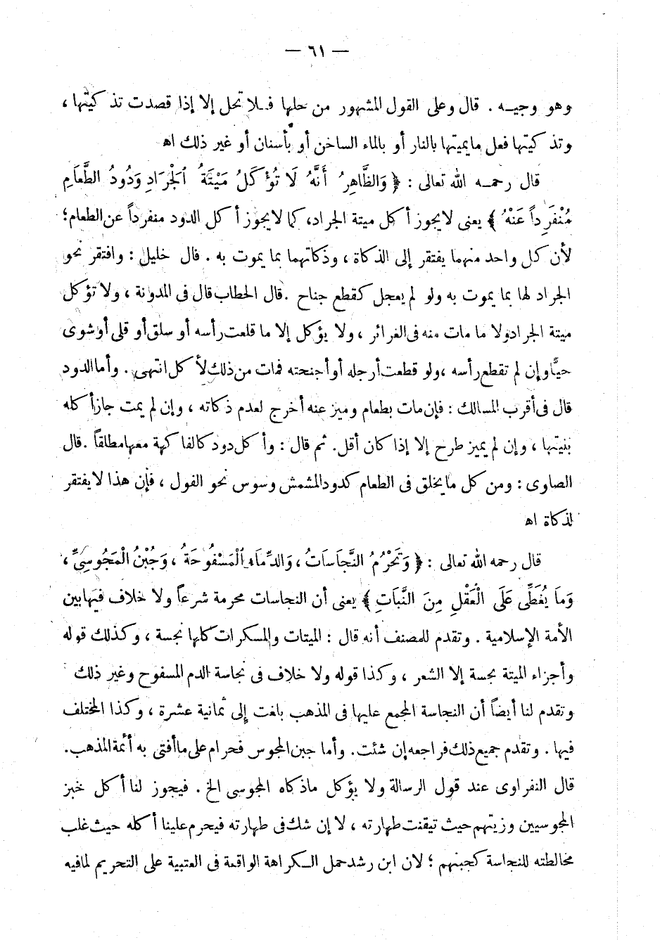 قال رحمه الله تعالى: " والظاهر أنه لا تؤكل ميتة الجراد ودود الطعام منفرداً عنه " يعني لا يجوز أكل ميتة الجراد، كما لا يجوز أكل الدود منفرداً عن الطعام، لأن كل واحد منهما يفتقر إلى الذكاة، وذكاتهما بما يموت به. قال خليل: وافتقر نحو الجراد لها بما يموت به ولو لم يعجل كقطع جناح. قال الحطاب قال في المدونة: ولا تؤكل ميتة الجراد ولا ما مات منه في الغرائر، ولا يؤكل إلا ما قلع رأسه أو سلق أو قلى أو شوي حياً وإن لم يقطع رأسه، ولو قطعت أرجله أو أجنحته فمات من ذلك لأكل انتهى. وأما الدود قال في أقرب المسالك: فإن مات بطعام وميز عنه أخرج لعدم ذكاته، وإن لم يمت جاز أكله بنيتها، وإن لم يميز طرح إلا إذا كان أقل. ثم قال: وأكل دود الفاكهة معها مطلقاً. قال الصاوي: ومن كل ما يخلق في الطعام كدود المشمش وسوس نحو الفول، فإن هذا لا يفتقر لذكاة اهـ.