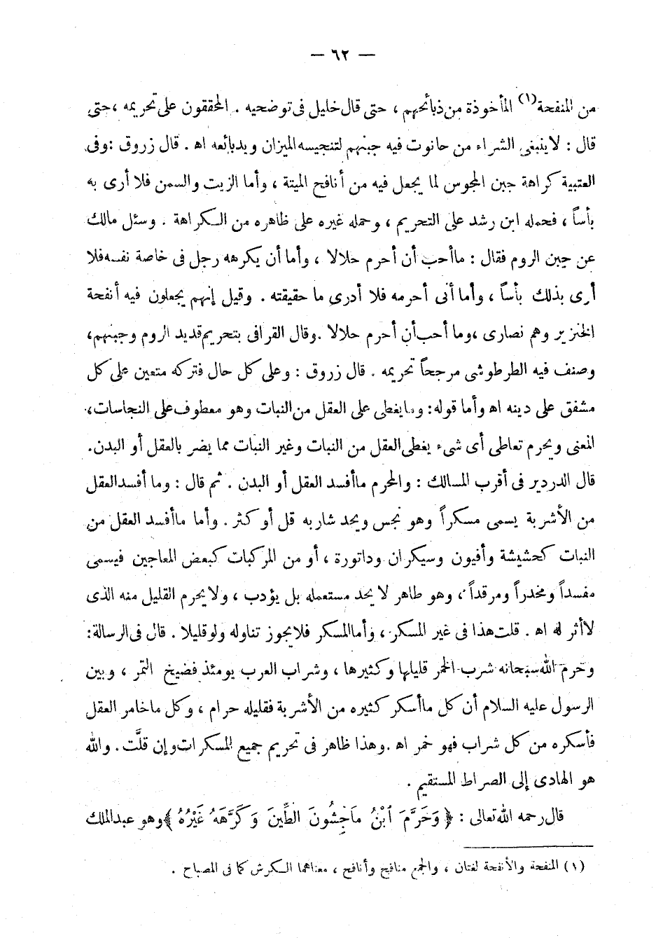 فحمله ابن رشد على التحريم، وحمله غيره على ظاهره من الكراهة. وسئل مالك عن جبن الرم فقال: ما أحب أن أحرم حلالاً، وأما أن يكرهه رجل في خاصة نفسه فلا أرى بذلك بأساً، وأما أني أحرمه فلا أدري ما حقيقته. وقيل إنهم يجعلون فيه أنفحة الخنزير وهم نصارى، وما أحب أن أحرم حلالاً. وقال القرافي بتحريم قديد الروم وجبنهم، وصنف فيه الطرطوشي مرجحاً تحريمه. قال زروق: وعلى كل حال فتركه متعين على كل مشفق على دينه اهـ وأما قوله: وما يغطي على العقل من النبات وهو معطوف على النجاسات، المعنى ويحرم تعاطي أي شيء يغطي العقل من النبات وغير النبات مما يضر العقل أو البدن. قال الدردير في أقرب المسالك: والمحرم ما أفسد العقل أو البدن. ثم قال: وما أفسد العقل من الأشربة يسمى مسكراً وهو نجس ويحد شاربه قل أو كثر. وأما ما أفسد العقل من النبات كحشيشة وأفيون وسيكران وداتورة، أو من المركبات كبعض المعاجين فيسمى مفسداً ومخدراً ومرقداً، وهو طاهر لا يحد مستعمله بل يؤدب، ولا يحرم القليل منه الذي لا أثر له اهـ. قلت هذا في غير المسكر، وأما المسكر فلا يجوز تناوله ولو قليلاً. قال في الرسالة: وحرم الله سبحانه شرب الخمر قليلها وكثيرها، وشراب العرب يومئذ فضيخ التمر، وبين الرسول صلى الله عليه وسلم أن كل ما أسكر كثيره من الأشربة فقليله حرام، وكل ما خامر العقل فأسكر، من كل شراب فهو خمر اهـ. وهذا ظاهر في تحريم جميع المسكرات وإن قلت. والله هو الهادي إلى الصراط المستقيم.