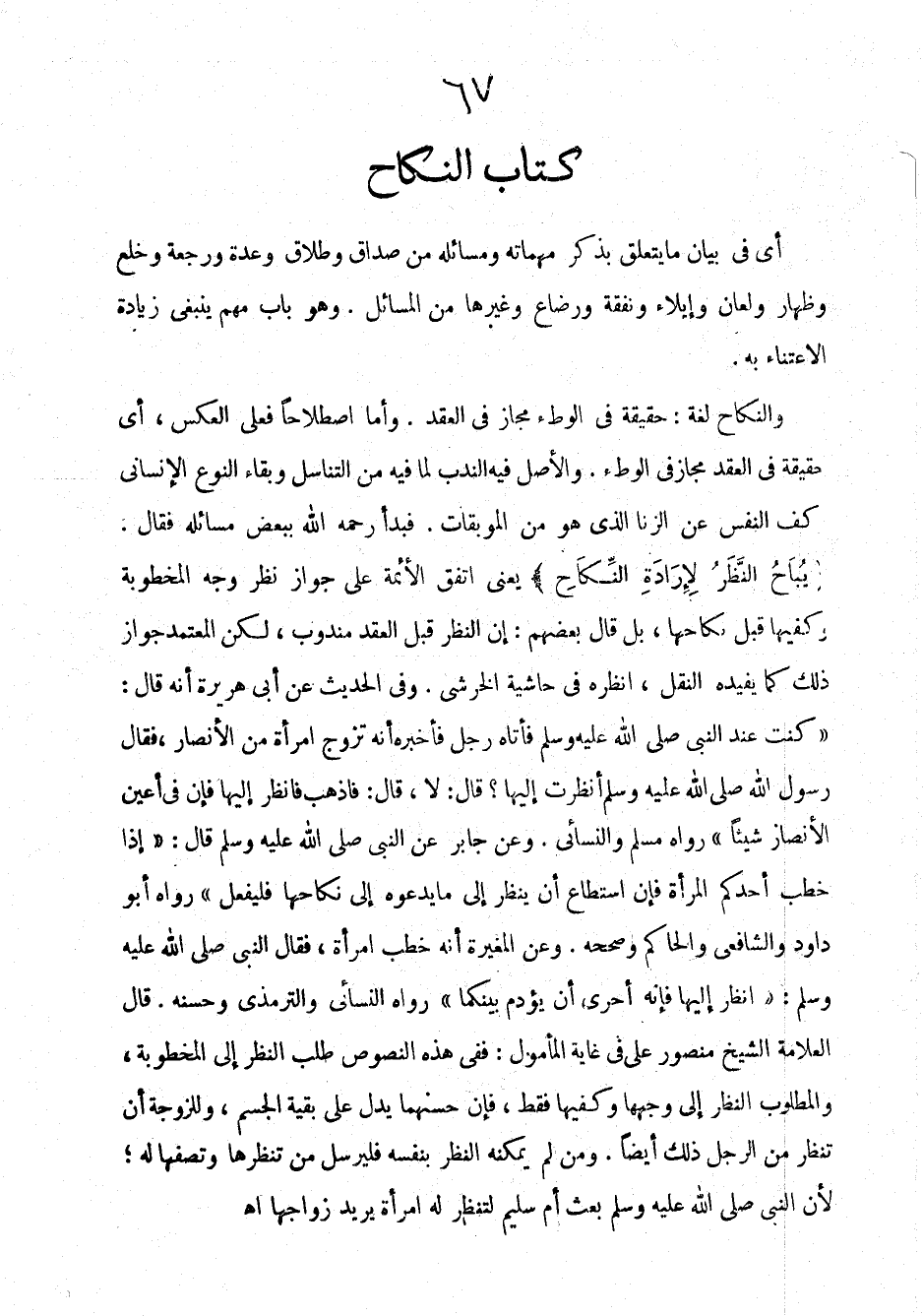 والنكاح لغة: حقيقة في الوطء مجاز في العقد. وأما اصطلاحاً فعلى العكس، أي حقيقة في العقد مجاز في الوطء. والأصل فيه الندب لما فيه من التناسل وبقاء النوع الإنساني وكف النفس عن الزنا الذي هو من الموبقات. فبدأ رحمه الله ببعض مسائله فقال: " يباح النظر لإرادة النكاح " يعني اتفق الأئمة على جواز نظر وجه المخطوبة وكفيها قبل نكاحها، بل قال بعضهم: إن النظر قبل العقد مندوب، لكن المعتمد جواز ذلك كما يفيده النقل، انظره في حاشية الخرشي. وفي الحديث عن أبي هريرة أنه قال: " كنت عند النبي صلى الله عليه وسلم فأتاه رجل فأخبره أنه تزوج امرأة من الأنصار، فقال رسول الله صلى الله عليه وسلم أنظرت إليها؟ قال: لا، قال: فاذهب فانظر إليها فإن في أعين الأنصار شيئاً " رواه مسلم والنسائي. وعن جابر عن النبي صلى الله عليه وسلم قال: " إذا خطب أحدكم المرأة فإن استطاع أن ينظر إلى ما يدعوه إلى نكاحها فليفعل " رواه أبو داود والشافعي والحاكم وصححه. وعن المغيرة أنه خطب امرأة، فقال النبي صلى الله عليه وسلم: " انظر إليها فإنه أحرى أن يؤدم بينكما " رواه النسائي والترمذي وحسنه. قال العلامة الشيخ منصور على في غاية المأمول: ففي هذه النصوص طلب النظر إلى المخطوبة، والمطلوب النظر إلى وجهها وكفيها فقط، فإن حسنهما يدل على بقية الجسم، وللزوجة أن تنظر من الرجل ذلك أيضاً. ومن لم يمكنه النظر بنفسه فليرسل من تنظرها وتصفها له؛ لأن النبي صلى الله عليه وسلم بعث أم سليم لتنظر له امرأة يريد زواجها اهـ.