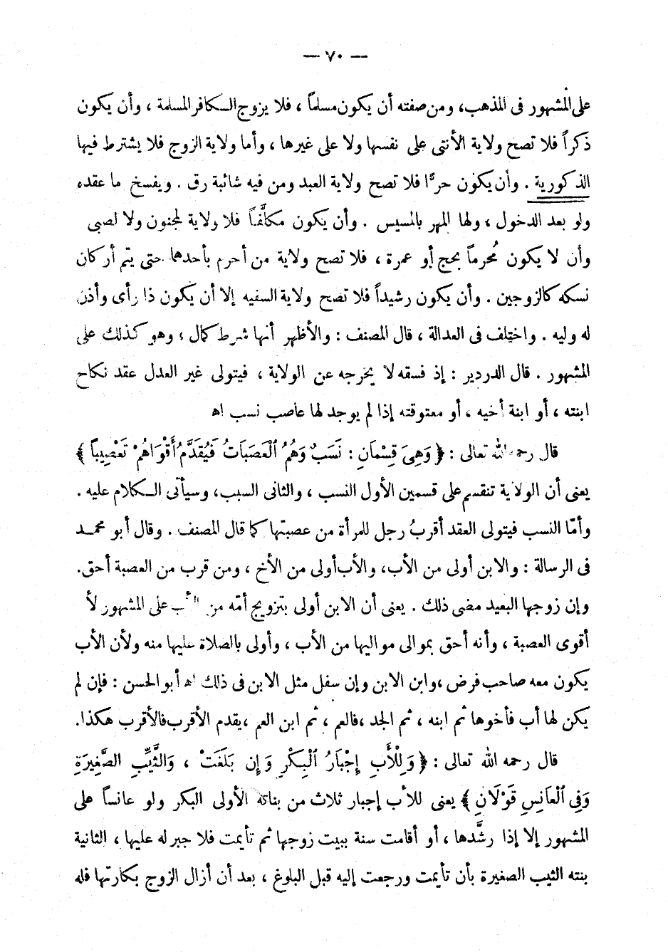 قال رحمه الله تعالى: " وهي قسمان: نسب وهم العصبات فيقدم أقواهم تعصيباً " يعني أن الولاية تنقسم على قسمين الأول النسب، والثاني السبب، وسيأتي الكلام عليه. وأما النسب فيتولى العقد أقرب رجل للمرأة من عصبتها كما قال المصنف. وقال أبو محمد في الرسالة: والابن أولى من الأب، والأب أولى من الأخ، ومن قرب من العصبة أحق. وإن زوجها البعيد مضى ذلك. يعني أن الابن أولى بتزويج أمه من الأب على المشهور لا أقوى العصبة، وأنه أحق بموالي مواليها من الأب، وأولى بالصلاة عليها منه ولأن الأب يكون معه صاحب فرض، وابن الابن وإن سفل مثل الابن في ذلك اهـ أبو الحسن: فإن لم يكن لها أب فأخوها ثم ابنه، ثم الجد، فالعم، ثم ابن العم، يقدم الأقرب فالأقرب هكذا.