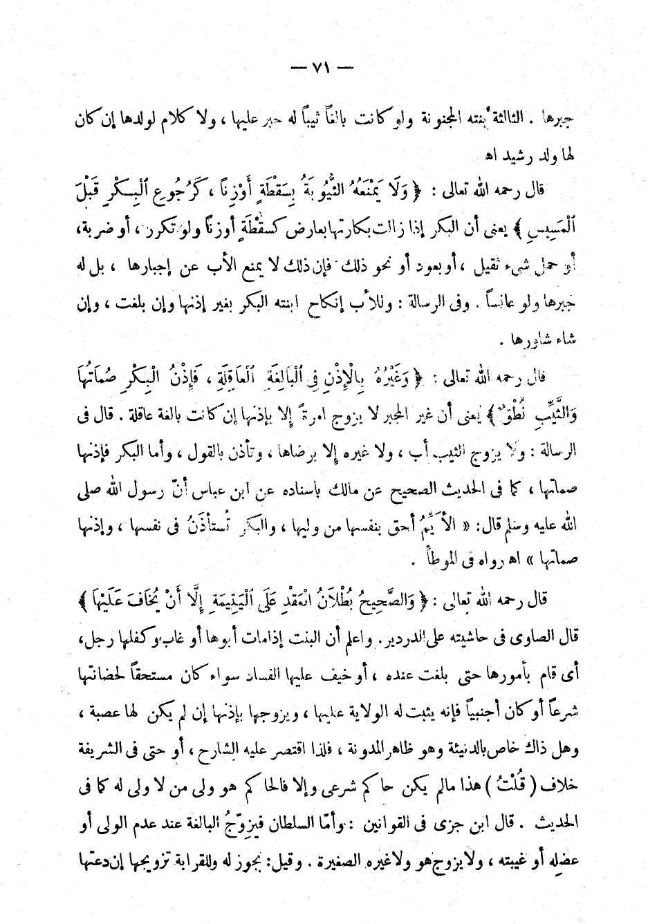 فله جبرها. الثالثة بنته المجنونة ولو كانت بالغاً ثيباً له جبر عليها، ولا كلام لولدها إن كان لها ولد رشيد اهـ.