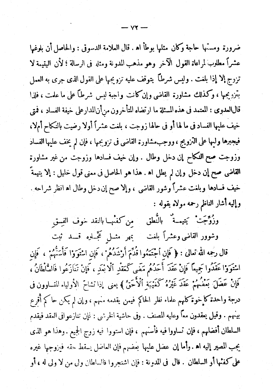 فلذا قال العدوي: المعتمد في هذه المسألة ما ارتضاه المتأخرون من أن المدار على خيفة الفساد، فمتى خيف عليها الفساد في مالها أو في حالها زوجت، بلغت عشراً أو لا رضيت بالنكاح أم لا، فيجبرها وليها على التزويج، ووجب مشاورة القاضي في تزويجها، فإن لم يخف عليها الفساد وزوجت صح النكاح إن دخل وطال. وإن خيف فسادها وزوجت من غير مشاورة القاضي صح إن دخل وإن لم يطل اهـ. هذا هو الحاصل في معنى قول خليل: إلا يتيمة خيف فسادها وبلغت عشراً وشور القاضي، وإلا صح إن دخل وطال اهـ انظر شراحه وإليه أشار الناظم رحمه مولاه بقوله: