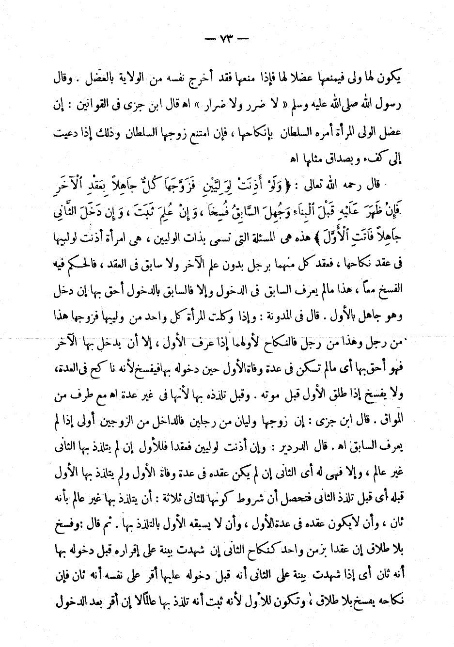 يكون لها ولي فيمنعها عضلاً لها فإذا منعها فقد أخرد نفسه من الولاية بالعضل. وقال رسول الله صلى الله عليه وسلم: " لا ضرر ولا ضرار " اهـ قال ابن جزي في القوانين: إن عضل الولي المرأة أمره السلطان بإنكاحها، فإن امتنع زوجها السلطان وذلك إذا دعيت إلى كفء وبصداق مثلها اهـ.