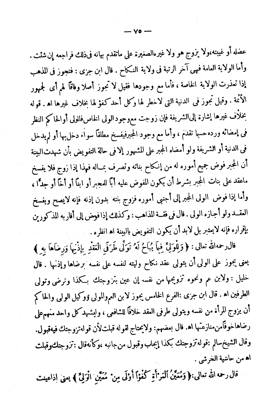 عضله أو غيبته، ولا يزوج هو ولا غيره الصغيرة على ما تقدم بيانه في ذلك فراجعه إن شئت. وأما الولاية العامة فهي آخر الرتبة في ولاية النكاح. قال ابن جزي: فتجوز في المذاهب إذا تعذرت الولاية الخاصة، فأما مع وجودها فقيل لا تجوز أصلاً وفاقاً لهم أي لجمهور الأئمة. وقيل تجوز في الدنية التي لا خطر لها وكل واحد كفؤ لها بخلاف غيرها اهـ. قوله بخلاف غيرها إشارة إلى الشريفة فإن زوجت مع وجود الولي الخاص فللولي أو الحاكم النظر في إمضائه ورده بحسبما تقدم، وأما مع وجود المجبر فيفسخ مطلقاً سواء دخل بها أو لم يدخل في الدنية أو الشريفة ولو أمضاه المجبر على المشهور إلا في حالة التفويض بأن شهدت البينة أن المجبر فوض جميع أموره له من إنكاح بناته وتصرف بماله فهذا إذا زوج فلا يفسخ ما عقد على بنات المجبر بشرط أن يكون المفوض عليه أباً للمجبر أو ابناً أو أخاً أو جداً، وأما إذا فوض الولي المجبر إلى أجنبي أموره فزوج بنته بدون إذنه غإنه لا يصح ويفسخ العقد ولو أجازه الولي. قال في فقه المذاهب: وكذلك إذا فوض إلى أقاربه المذكورين بإقراره فإنه لا يعتبر بل لا بد أن يكون التفويض بالبينة اهـ أنظره.