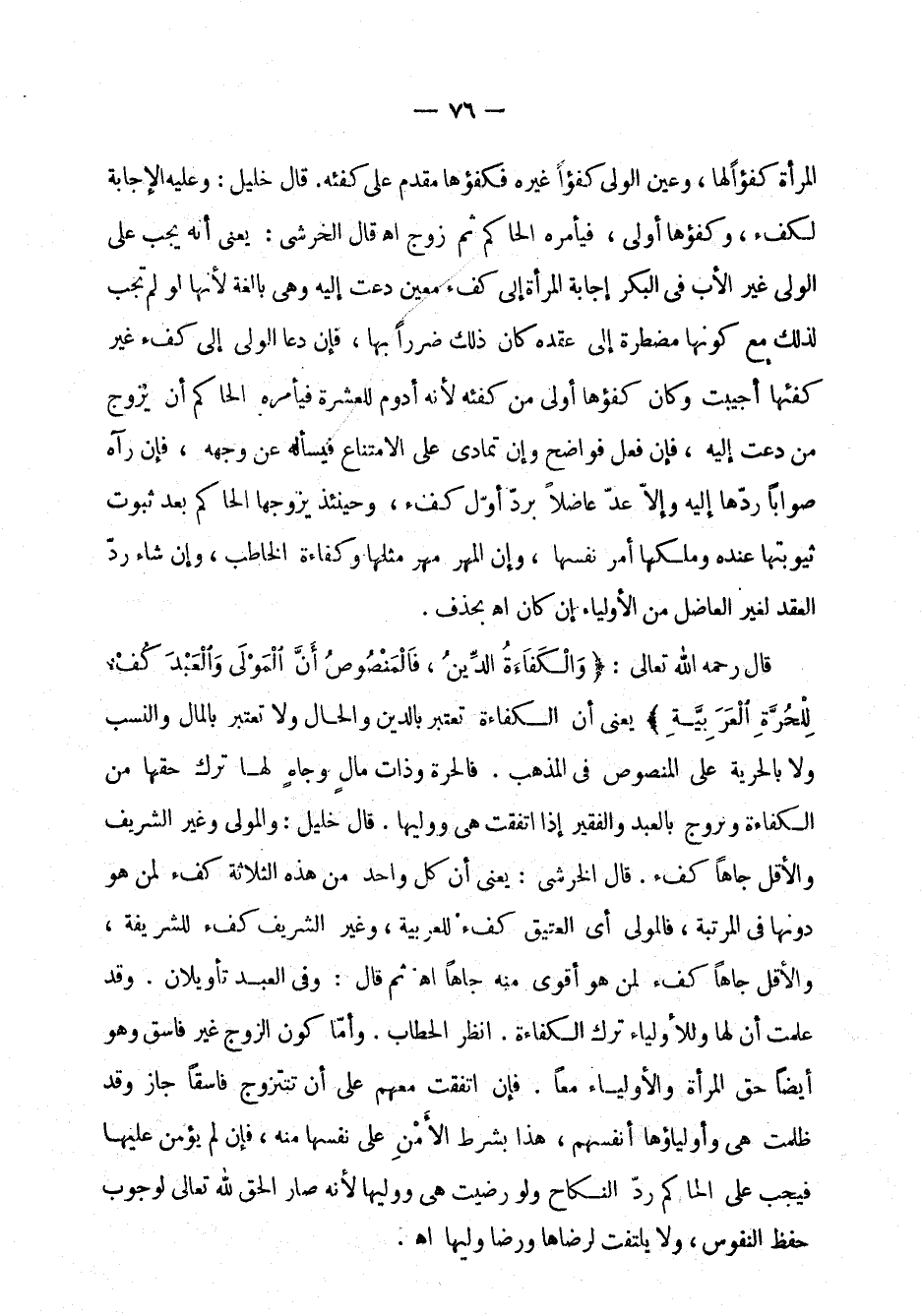 قال رحمه الله تعالى: " والكفاءة الدين، فالمنصوص أن المولى والعبد كفء للحرة العربية " يعني أن الكفاءة تعتبر بالدين والحال ولا تعتبر بالمال والنسب ولا بالحرية على المنصوص في المذهب. فالحرة وذات مال وجاه لها ترك حقها من الكفاءة وتزوج بالعبد والفقير إذا اتفقت هي ووليها. قال خليل: والمولى وغير الشريف والأقل جاهاً كفء. قال الخرشي: يعني أن كل واحد من هذه الثلاثة كفء لمن هو دونها في المرتبة، فالمولى أي العتيق كفء للعربية، وغير الشريف كفء للشريفة، والأقل جاهاً كفء لمن هو أقوى منه جاهاً اهـ ثم قال: وفي العبد تأويلان. وقد علمت أن لها وللأولياء ترك الكفاءة. انظر الحطاب. وأما كون الزوج غير فاسق وهو أيضاً حق المرأة والأولياء معاً. فإن اتفقت معهم على أن تتزوج فاسقاً جاز وقد ظلمت هي وأولياؤها أنفسهم، هذا بشرط الأمن على نفسها منه، فإن لم يؤمن عليها فيجب على الحاكم رد النكاح ولو رضيت هي ووليها لأنه صار الحق لله تعالى لوجوب حفظ النفوس، ولا يلتفت لرضاها ورضا وليها اهـ.