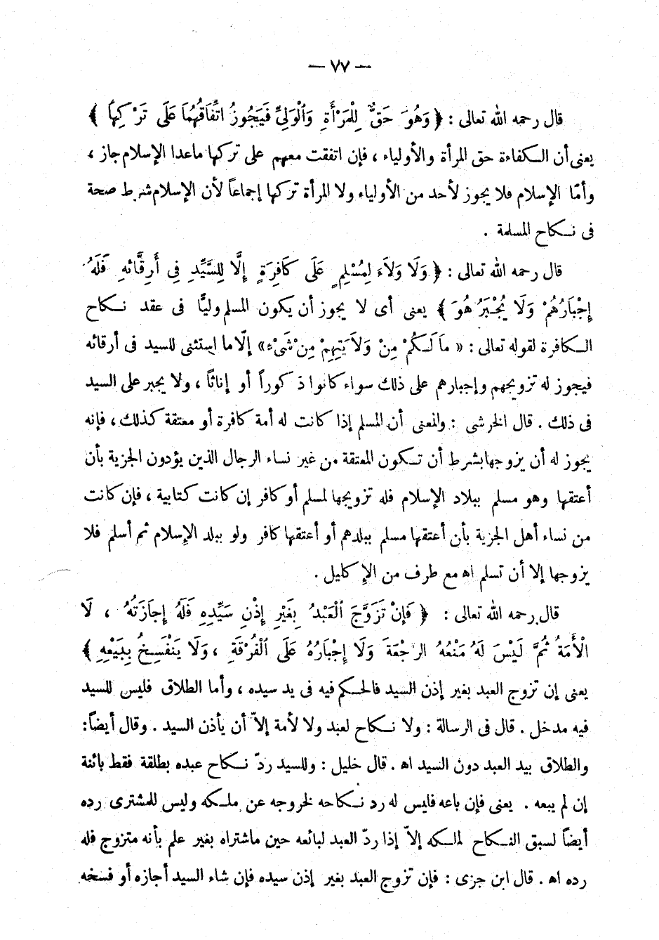 قال رحمه الله تعالى: " ولا ولاء لمسلم على كافرة إلا للسيد في أرقائه فله إجبارهم ولا يجبر هو " يعني أنه لا يجوز أن يكون المسلم ولياً في عقد نكاح الكافرة لقوله تعالى: {ما لكم من ولايتهم من شيء} [الأنفال: 72] إلا ما استثني للسيد في أرقائه فيجوز له تزويجهم وإجبارهم على ذلك سواء كانوا ذكوراً أو أناثاً، ولا يجبر على السيد في ذلك. قال الخرشي: والمعنى أن المسلم إذا كانت له أمة كافرة أو معتقة كذلك، فإنه يجوز له أن يزوجها بشرط أن تكون المعتقة من غير نساء الرجال الذين يؤدون الجزية بأن أعتقها وهو مسلم ببلاد الإسلام فله تزويجها لمسلم أو كافر إن كانت كتابية، فإن كانت من نساء أهل الجزية بأن أعتقها مسلم ببلدهم أو أعتقها كافر ولو ببلد الإسلام ثم أسلم فلا يزوجها إلا أن تسلم اهـ مع طرف من الإكليل.