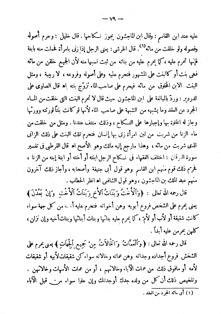 القاسم. وقال ابن الماجشون يجوز نكاحها. قال خليل: وحرم أصوله وفصوله ولو خلقت من مائه. قال الخرشي: يعني الرجل إذا زنى بامرأة فحملت منه بابنة فإنها تحرم عليه، كما يحرم عليه من بناته من ثبت نسبها منه لأن الجميع خلقن من مائه فهي بنت أو كالبنت على المشهور فتحرم عليه وعلى أصوله وفروعه، لا ربيبة، ومثل البنت الابن المخلوق من مائه فيحرم على صاحب الماء تزوج بنته اهـ قال الصاوي على الدردير: ورد بالمبالغة على ابن الماجشون حيث قال لا تحرم البنت التي خلقت من الماء المجرد عن الغقد وما يشبهه من الشبهة على صاحب الماء لأنها لو كانت بنتاً لورثته وورثها وجاز له الخلوة بها وإجبارها على النكاح، وذلك منتف عندنا. ومثل من خلقت من ماء الزنا من شربت من لبن امرأة زنى بها إنسان فتحرم تلك البنت على ذلك الزاني الذي شربت من مائه، وهذا ما رجع إليه مالك وهو الأصح اهـ قال القرطبي في تفسير سورة الفرقان: اختلف الفقهاء في نكاح الرجل ابنته أو أخته أو ابنة ابنه من الزنا، فحرم ذلك قوم منهم ابن القاسم وهو قول أبي حنيفة وأصحابه، وأجاز ذلك آخرون منهم عبد الملك بن الماجشون، وهو قول الشافعي اهـ أنظر الحطاب.